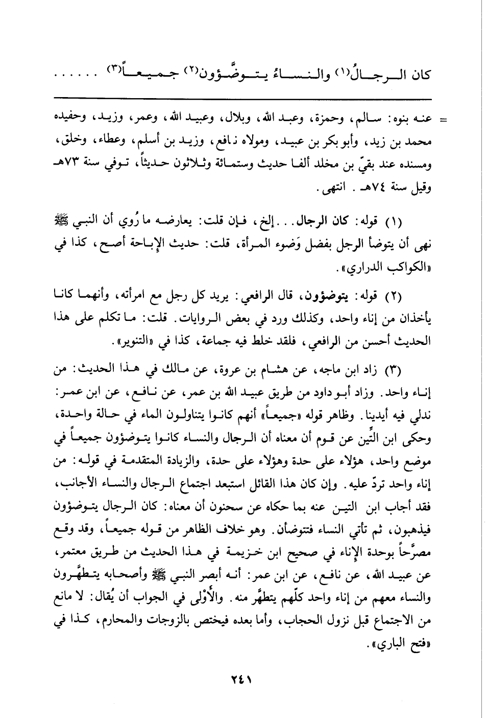 (¬3) زاد ابن ماجه، عن هشام بن عروة، عن مالك في هذا الحديث: من إناء واحد. وزاد أبو داود من طريق عبيد الله بن عمر، عن نافع، عن ابن عمر: ندلي فيه أيدينا. وظاهر قوله "جميعاً" أنهم كانوا يتناولون الماء في حالة واحدة، وحكى ابن التِّين عن قوم أن معناه أن الرجال والنساء كانوا يتوضؤون جميعاً في موضع واحد، هؤلاء على حده وهؤلاء على حده، والزيادة المتقدمة في قوله: من إناء واحد تردّ عليه. وإن كان هذا القائل استبعد اجتماع الرجال والنساء الأجانب، فقد أجاب ابن التِّين عنه بما حكاه عن سحنون أن معناه: كان الرجال يتوضؤون فيذهبون، ثم تأتي النساء فتتوضأن. وهو خلاف الظاهر من قوله جميعاً، وقد وقع مصرَّحاً بوحدة الإناء في صحيح ابن خزيمة في هذا الحديث من طرق معتمر، عن عبيد الله، عن نافع، عن ابن عمر: أنه أبصر النبي صلى الله عليه وسلم وأصحابه يتطهرون والنساء معهم من إناء واحد كلهم يتطهَّر منه، والأَولى في الجواب أن يقال: لا مانع من الاجتماع قبل نزول الحجاب، وأما بعده بالزوجات والمحارم، كذا في "فتح الباري".