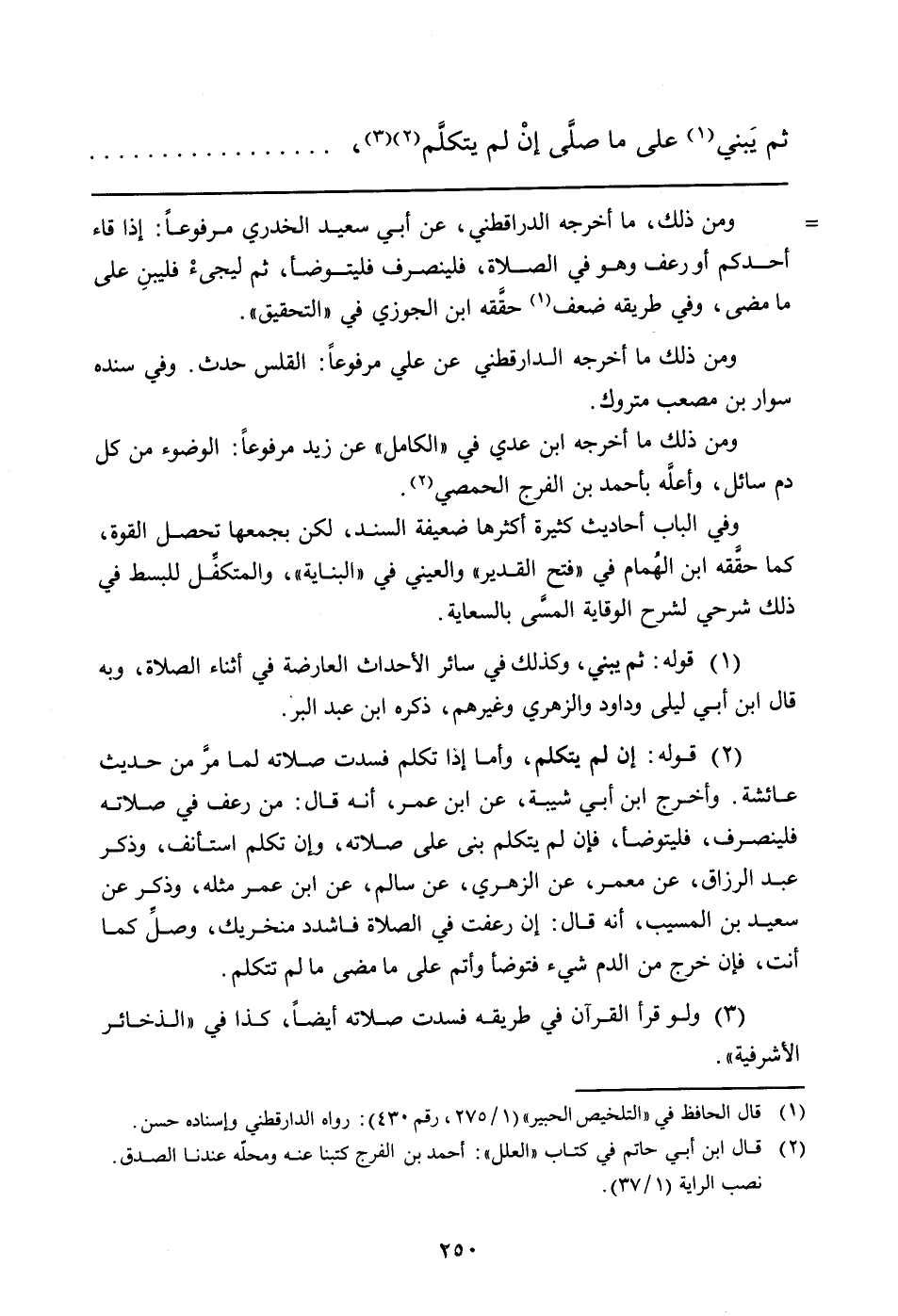 ومن ذلك، ما أخرجه الدارقطني، عن أبي سعيد الخدري مرفوعاً: إذا قاء أحدكم أو رعف وهو في الصلاة، فلينصرف فليتوضأ، ثم ليجئْ فليبنِ على ما مضى، وفي طريقه ضعف (قال الحافظ في "التلخيص الحبير" (1/275، رقم 430) : رواه الدارقطني وإسناده حسن) حقَّقه ابن الجوزي في "التحقيق".