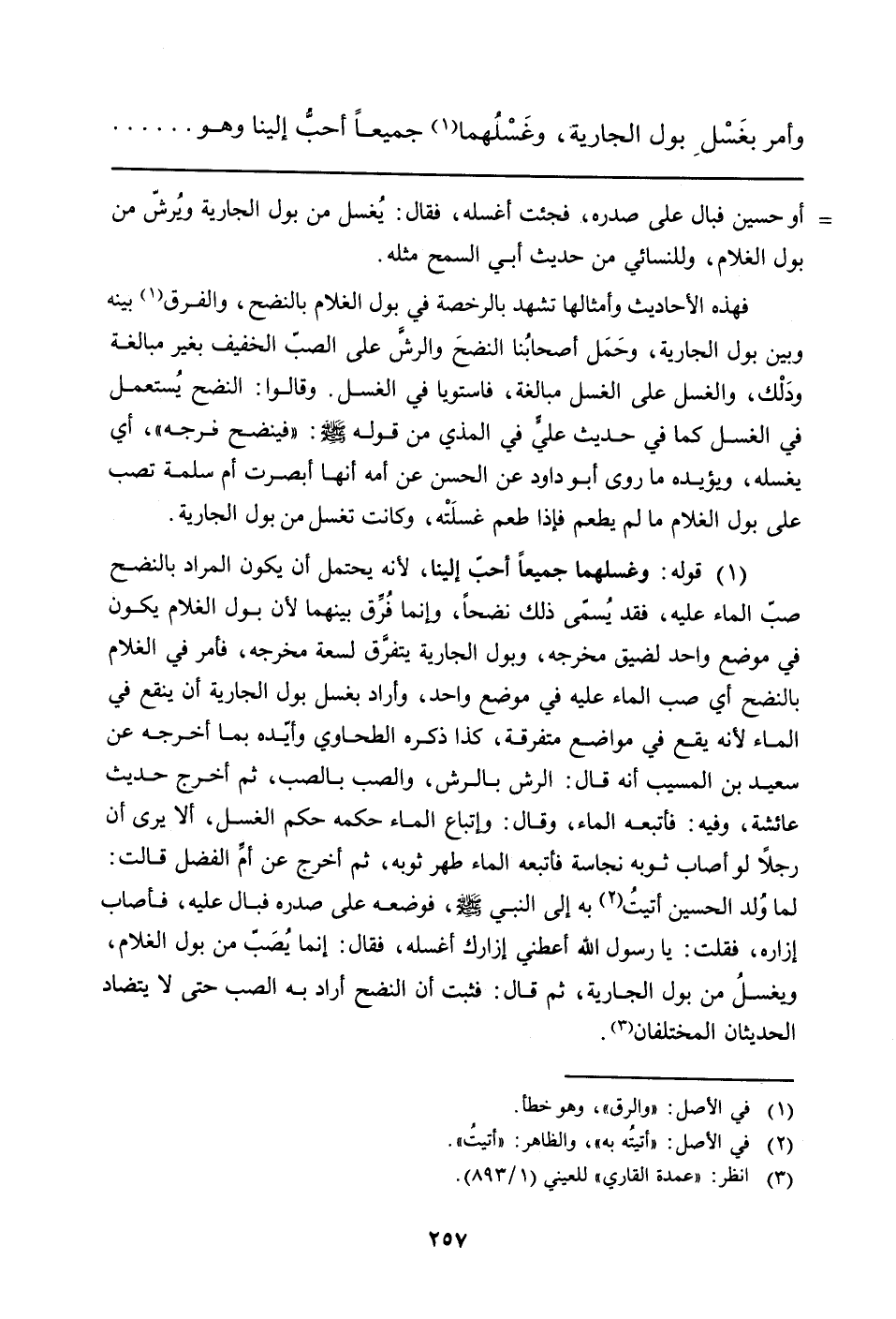 (¬1) قوله: وغسلهما جميعاً أحب إلينا، لأنه يحتمل أن يكون المراد بالنضح صبّ الماء عليه، فقد يُسمى ذلك نضحاً، وإنما فُرِّق بينهما لأن بول الغلام يكون في موضع واحد لمخرجه، وبول الجارية يتفرَّق لسعة مخرجه، فأمر في الغلام بالنضح أي صب الماء عليه في موضع واحد، وأراد بغسل بول الجارية أن ينقع في الماء لأنه يقع في مواضع متفرقة، كذا ذكره الطحاوي وأيّده بما أخرجه عن سعيد بن المسيب أنه قال: الرش بالرش، والصب بالصب، ثم أخرج حديث عائشة وفيه: فأتبعه الماء، وقال: وإتباع الماء حكمه حكم الغسل، ألا يرى أن رجلاً لو أصاب ثوبه نجاسة فأتبعه الماء طهر ثوبه، ثم أخرج عن أم الفضل قالت: لما وُلد الحسين أتيت (في الأصل: "أتيتُه به"، والظاهر"أتيتُ") ، به إلى النبي صلى الله عليه وسلم، فوضعته على صدره فبال عليه، فأصاب إزاره، فقلت: يا رسول الله أعطني إزارك أغسله، فقال: إنما يُصَبّ من بول الغلام، ويغسلُ من بول الجارية، ثم قال: فثبت أن النضح أراد به الصب حتى لا يتضاد الحديثان المختلفان (انظر: "عمدة القاري" للعيني (1/893)) .