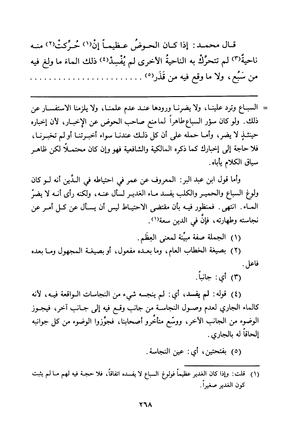 وأما قول ابن عبد البر: المعروف عن عمر في احتياطه في الدَّين أنه لو كان ولوغ السباع والحمير والكلب يفسد ماء الغدير لسأل عنه، ولكنه رأى أنه لا يضرّ الماء. انتهى. فمنظور فيه بأن مقتضى الاحتياط ليس أن يسأل عن كل أمر عن نجاسته وطهارته، فإنَّ في الدين سعة (قلت: وإذا كان الغدير عظيماً فولوغ السباع لا يفسده اتفاقاً، فلا حجة فيه لهم ما لم يثبت كون الغدير صغيراً) .