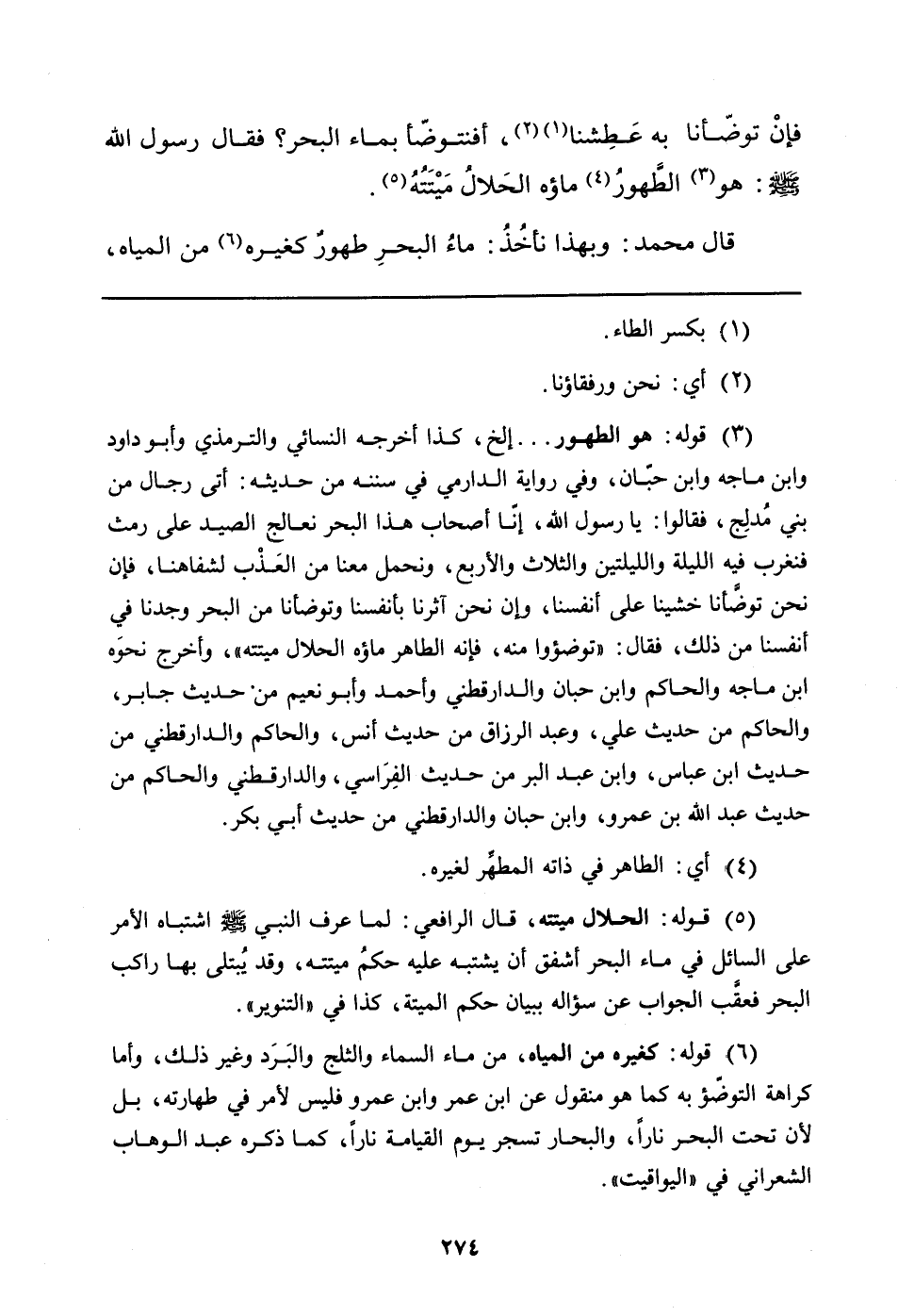 (¬3) قوله: هو الطهور ... إلخ، كذا أخرجه النسائي والترمذي وأبو داود وابن ماجة وابن حبّان، وفي رواية الدارمي في سننه من حديثه: أتى رجال من بني مُدلِج، فقالوا: يا رسول الله، إنّا أصحاب هذا البحر نعالج الصيد على رمث فنغرب فيه الليلة والليلتين والثلاث والأربع، ونحمل معنا من العَذب لشفاهنا، فإن نحن توضَّأنا خشينا على أنفسنا، وإن نحن آثرنا بأنفسنا وتوضأنا من البحر وجدنا في أنفسنا من ذلك، فقال: "توضؤوا منه، فإنه الطاهر ماؤه الحلال ميتته"، أخرج نحوه ابن ماجة والحاكم وابن حبان والدارقطني وأحمد وأبو نعيم من حديث جابر والحاكم من حديث علي، وعبد الرزاق من حديث أنس، والحاكم والدارقطني من حديث ابن عباس، وابن عبد البر من حديث الفِرَاسي، والدارقطني والحاكم من حديث عبد الله بن عمرو، وابن حبان والدارقطني من حديث أبي بكر.