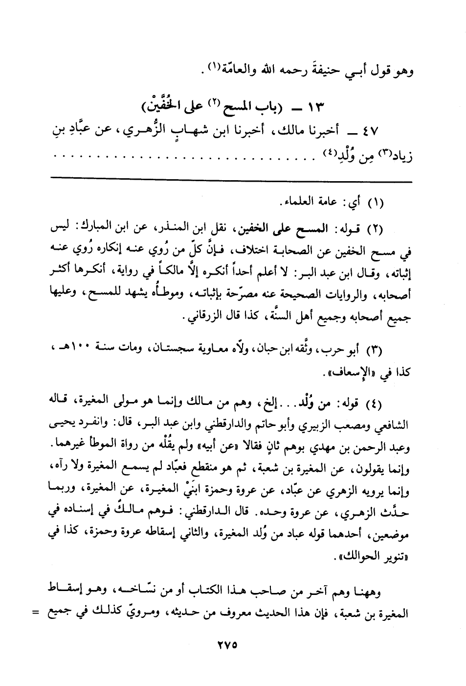 (¬4) قوله: من وُلد ... إلخ، وهم من مالك وإنما هو مولى المغيرة، قاله الشافعي ومصعب الزبيري وأبو حاتم والدارقطني وابن عبد البر، قال: وانفرد يحيى وعبد الرحمن بن مهدي بوهم ثانٍ فقالا "عن أبيه" ولم يقُله من رواة الموطأ غيرهما. وإنما يقولون عن المغيرة بن شعبة ثم هو منقطع فعبّاد لم يسمع المغيرة ولا رآه وإنما يرويه الزهري، عن عباد، عن عروة حمزة ابنَي المغيرة، عن المغيرة، وربما حدَّث الزهري، عن عرو وحده. قال الدارقطني: فوهم مالكٌ في إسناده في موضعين، أحدهما قوله عباد من وُلد المغيرة، والثاني إسقاطه عروة وحمزة، كذا في "تنوير الحوالك".