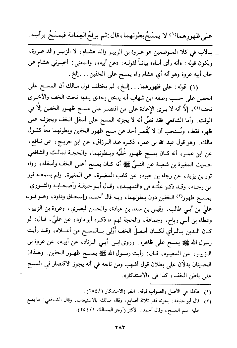 (¬1) قوله: على ظهورهما ... إلخ، لم يختلف قول مالك أن المسح على الخفين على حسب وصفه ابن شهاب أنه يدخل إحدى يديه تحت الخف والأخرى تحته (هكذا في الأصل والصواب فوقه. انظر (الاستذكار 1/284)) ، إلا أنه لا يرى الإعادة على من اقتصر على مسح ظهور الخفين إلاَّ في الوقت. وأما الشافعي فقد نصَّ أنه لا يجزئه المسح على أسفل الخف ويجزئه على ظهره فقط، ويُستحب أن لا يُقْصر أحد عن مسح ظهور الخفين وبطونهما معاً كقول مالك. وهو قول عبد الله بن عمر، ذكره عبد الرزاق، عن ابن جريج، عن نافع، عن ابن عمر، أنه كان يمسح ظهور خُفِّيه وبطونهما، والحجة لمالك والشافعي حديث المغيرة بن شعبة عن النبيّ صلى الله عليه وسلم أنه كان يمسح أعلى الخف وأسفله، رواه ثور بن يزيد عن رجاء بن حيوة، عن كاتب المغيرة، عن المغيرة، ولم يسمعه ثور من رجاء، وقد ذكر علَّته في "التمهيد:، وقال أبو حنيفة وأصحابه والثوري: يمسح ظهور (قال أبو حنيفة: يجزئه قدر ثلاثة أصابع، وقال مالك بالاستيعاب، وقال الشافعي: ما يقع عليه اسم المسح، وقال أحمد: الأكثر"أوجز المسالك 1/254) الخفين دون بطونهما، وبه قال أحمد وإسحاق وداود، وهو قول عليّ بن أبي طالب وقيس بن سعد بن عبادة والحسن البصري وعروة بن الزبير وعطاء بن أبي رباح، وجماعة، والحجة لهم ما ذكره أبو داود، عن عليّ، قال لو كان الدين بالرأي لكان أسفلُ الخف أَولى بالمسح من أعلاه، وقد رأيت رسول الله صلى الله عليه وسلم يمسح على ظاهره. وروى ابن أبي الزناد، عن أبيه، عن عروة بن الزبير، عن المغيرة، قال: رأيت رسول الله صلى الله عليه وسلم يمسح ظهور الخفين. وهذان الحديثان يدلان على بطلان قول أشهب ومن تابعه أنه يجوز الاقتصار في المسح على باطن الخف، كذا في "الاستذكار".