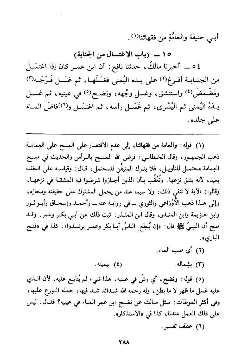 54 - أَخْبَرَنَا مالكٌ، حَدَّثَنَا نَافِعٌ: أَنَّ ابْنَ عُمَرَ كَانَ إِذَا اغتسَلَ مِنَ الْجَنَابَةِ أَفرغ (¬2) عَلَى يَدِهِ اليُمنى فغسَلَها، ثُمَّ غَسل فَرْجَه (¬3) ومَضْمَضَ (¬4) وَاسْتَنْشَقَ، وَغَسَلَ وَجْهَهُ، وَنَضَحَ (¬5) فِي عَيْنَيْهِ، ثُمَّ غَسَلَ يدَهُ اليُمنى ثُمَّ اليُسرى، ثم غَسَل رأسه، ثم اغتسل و (¬6) أفاض الماءَ على جلده.