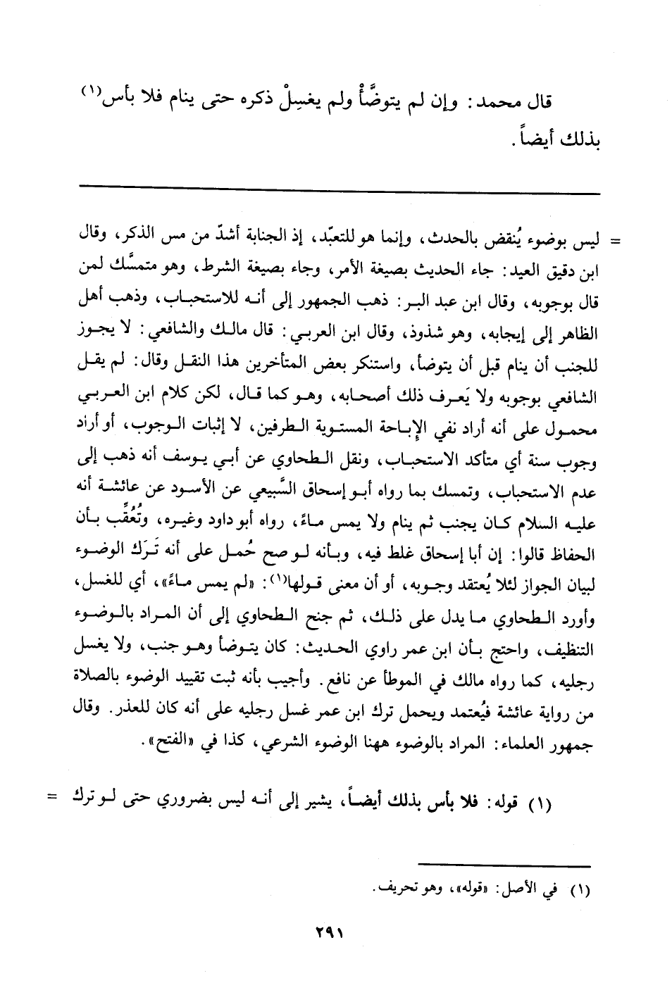 قال محمد: وإن لم يوضَّأ وَلَمْ يغسِل ذَكَرَهُ حَتَّى يَنَامَ فَلا بَأْسَ (¬1) بذلك أيضاً.