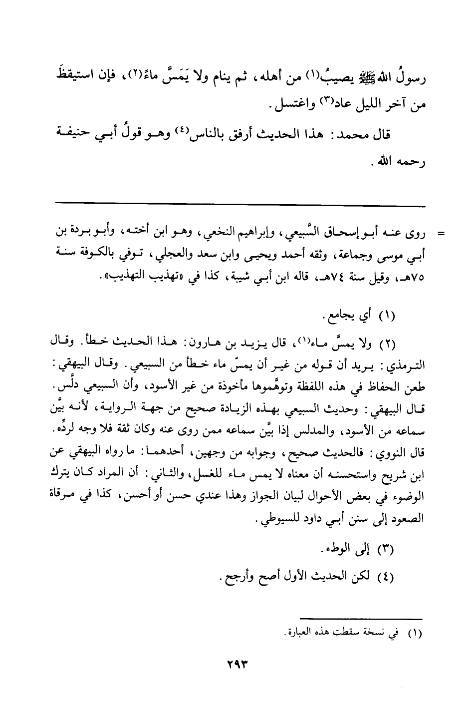 (¬2) ولا يمسَّ ماء (في نسخة سقطت هذه العبارة) ، قال يزيد بن هارون: هذا الحديث خطأ. وقال الترمذي: يريد أن قوله من غير أن يمسّ ماء خطأ من السبيعي. وقال البيهقي: طعن الحفاظ في هذه اللفظة وتوهَّموها مأخوة من غير الأسود، وأن السبيعي دلَّس. قال البيهقي: وحديث السبيعي بهذه الزيادة صحيح من جهة الرواية، لأنه بيَّن سماعه من الأسود، والمدلس إذا بيَّن سماعه ممن روى عنه وكان ثقة فلا وجه لردِّه. قال النووي: فالحديث صحيح، وجوابه من وجهين، أحدهما: ما رواه البيهقي عن ابن شريح واستحسنه أن معناه لا يمس ماء للغسل، والثاني: أن المراد كان يترك الوضوء في بعض الأحوال لبيان الجواز وهذا عندي حسن أو أحسن، كذا في مرقاة الصعود إلى سنن أبي داود للسيوطي.