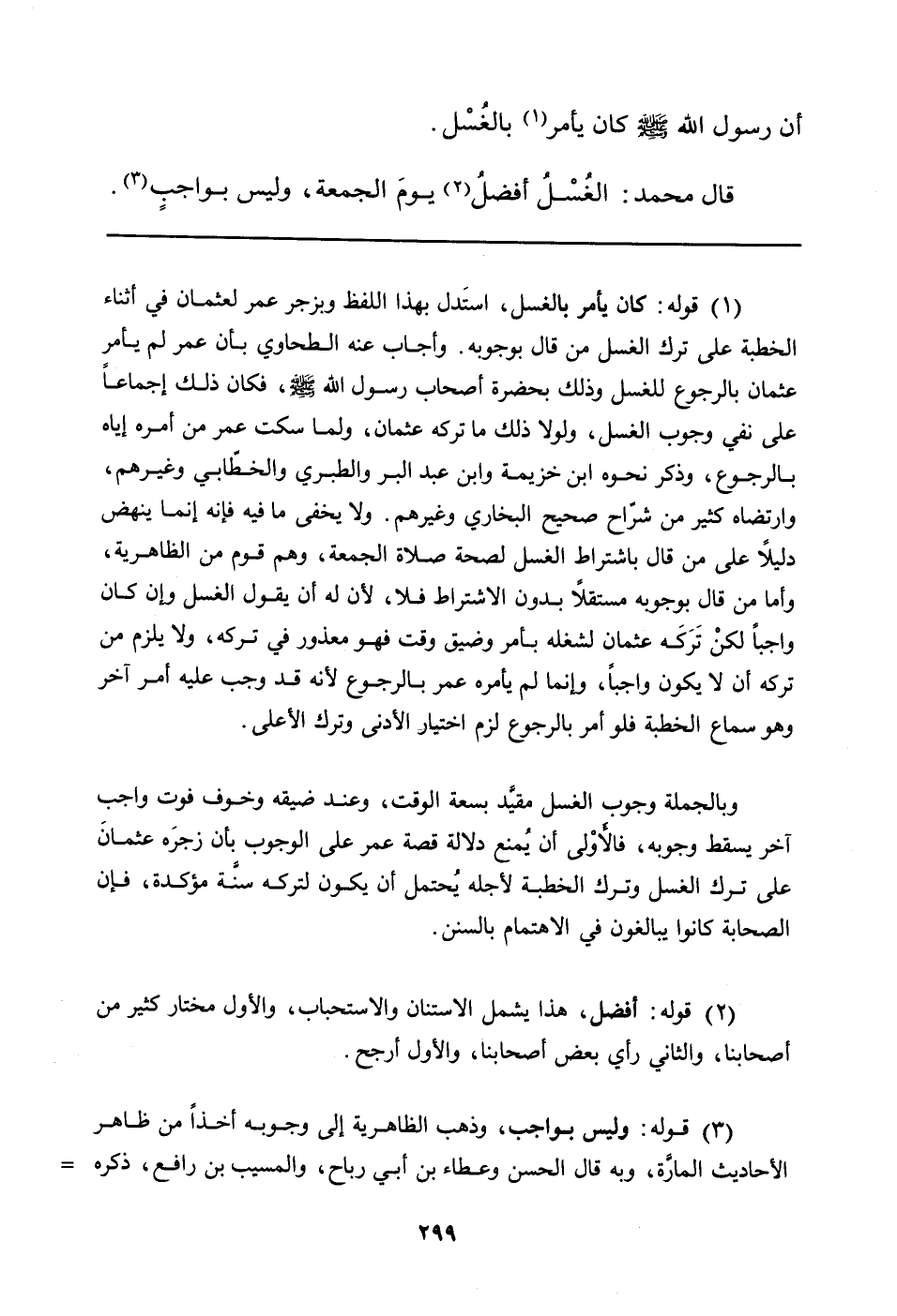 قَالَ مُحَمَّدٌ: الغُسْلُ أفضلُ (¬2) يومَ الجمعة، وليس بواجبٍ (¬3) .