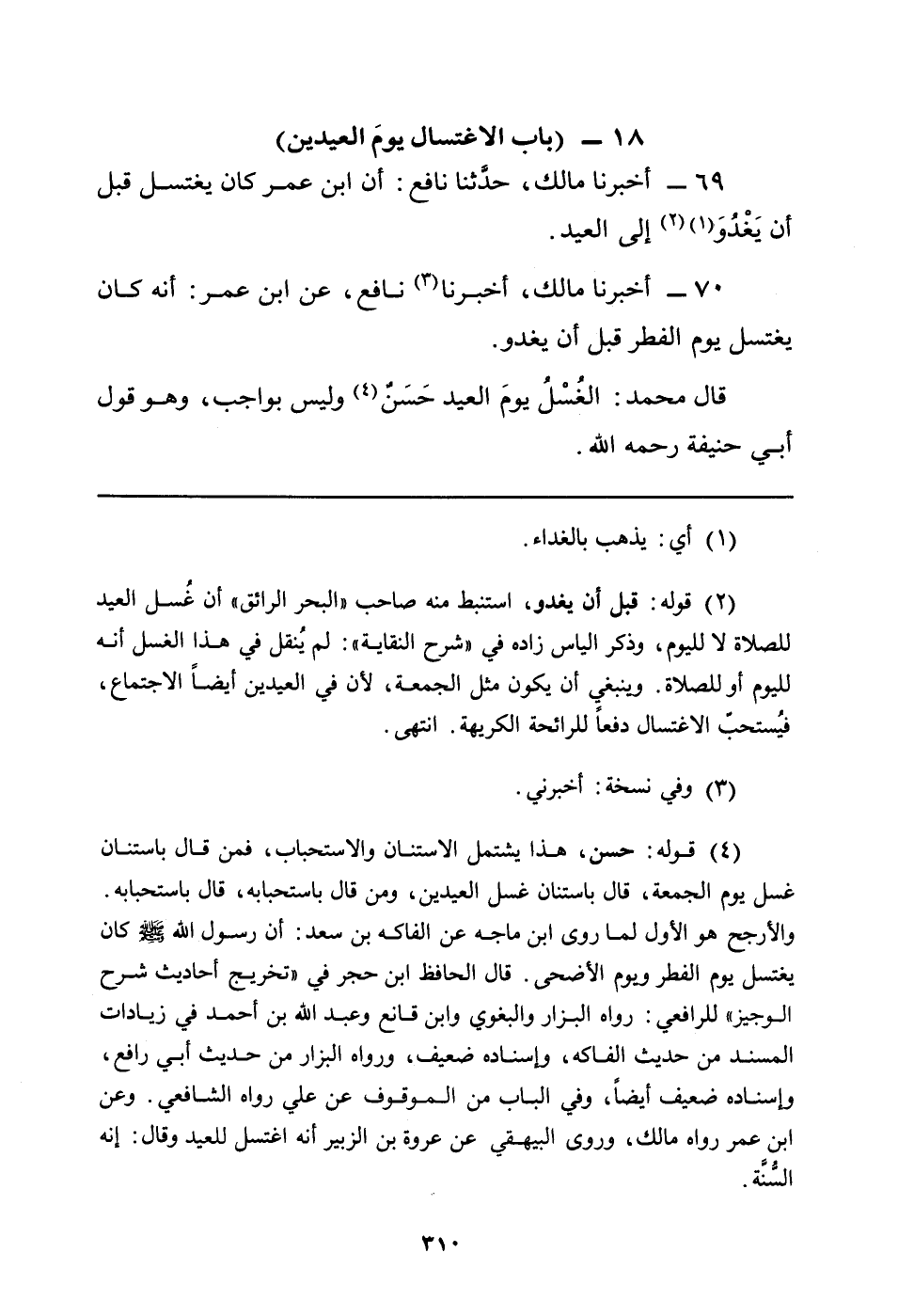 69 - أَخْبَرَنَا مَالِكٌ، حَدَّثَنَا نَافِعٌ: أَنَّ ابْنَ عُمَرَ كَانَ يَغْتَسِلُ قَبْلَ أَنْ يَغْدُوَ (¬1) (¬2) إِلَى الْعِيدِ.