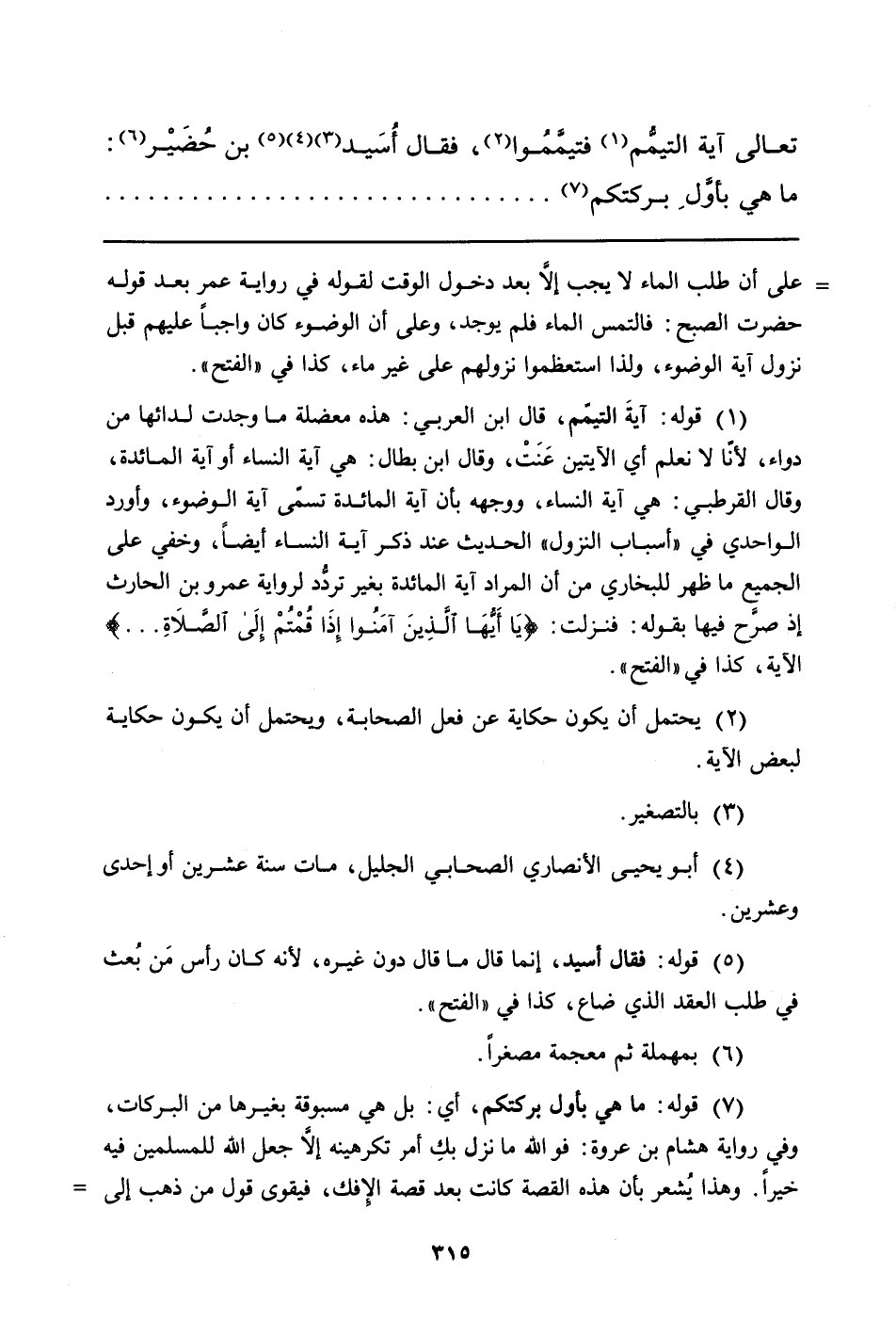 (¬1) قوله: آية التيمم، قال ابن العربي: هذه معضلة ما وجدت لدائها من دواء، لأنّا لا نعلم أي الآيتين عَنَتْ، وقال ابن بطال: هي آية النساء أو آية المائدة وقال القرطبي: هي آية النساء، ووجهه بأن آية المائدة تسمى آية الوضوء، وأورد الواحدي في "أسباب النزول" الحديث عند ذكر آية النساء أيضاً، وخفي على الجميع ما ظهر للبخاري من أن المراد آية المائدة بغير تردد لرواية عمرو بن الحارث إذ صرَّح فيها بقوله: "فنزلت: {يَا أَيُّها الَّذينَ آمَنُوا إذَا قُمْتُمْ إلَى الصَّلاةِ ... } الآية، كذا في "الفتح".