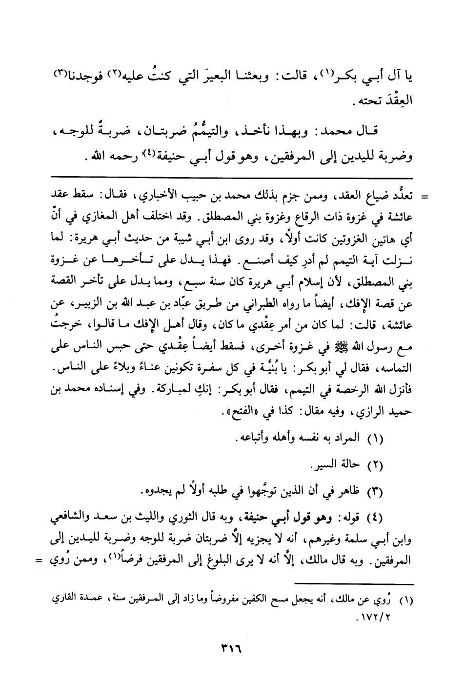 (¬4) قوله: وهو قول أبي حنيفة، وبه قال الثوري والليث بن سعد والشافعي وابن أبي سلمة وغيرهم، أنه لا يجزيه إلاَّ ضربتان ضربة للوجه وضربة لليدين إلى المرفقين. وبه قال مالك، إلاَّ أنه لا يرى البلوغ إلى المرفقين فرضاً (روي عن مالك، أنه يجعل مسح الكفين مفروضاً وما زاد إلى المرفقين سنة، عمدة القاري 2/172) ، وممن روي