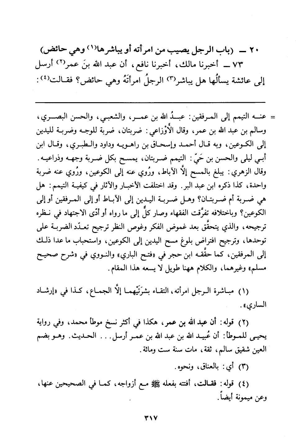 73 - أَخْبَرَنَا مَالِكٌ، أَخْبَرَنَا نَافِعٌ، أَنَّ عَبْدَ اللَّهِ بْنَ عُمَرَ (¬2) أَرْسَلَ إِلَى عَائِشَةَ يسألُها هَلْ يُبَاشِرُ (¬3) الرجلُ امرأتَهُ وَهِيَ حَائِضٌ؟ فقالت (¬4) :