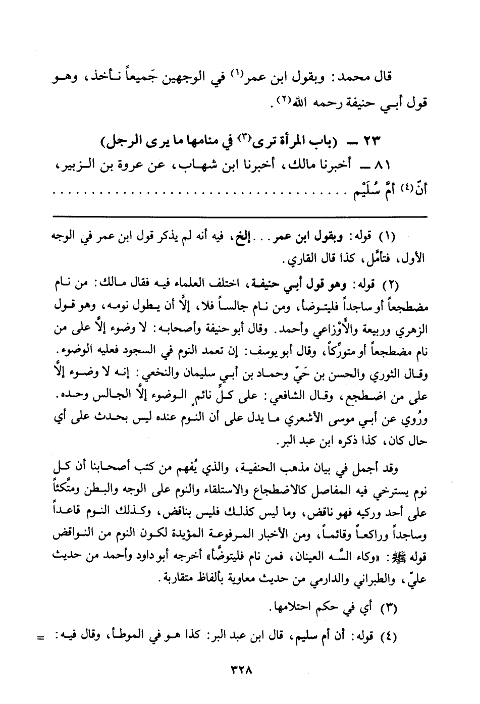 (¬2) قوله: وهو قول أبي حنيفة، اختلف العلماء فيه فقال مالك: من نام مضطجعاً أو ساجداً فليتوضأ، ومن نام جالساً فلا، إلاَّ أن يطول نومه، وهو قول الزهري وربيعة والأَوْزاعي وأحمد. وقال أبو حنيفة وأصحابه: لا وضوء إلاَّ على من نام مضطجعاً أو متورِّكاً، وقال أبو يوسف: إن تعمد النوم في السجود فعليه الوضوء. وقال الثوري والحسن بن حَيّ وحماد بن أبي سليمان والنخعي: إنه لا وضوء إلاَّ على من اضطجع، وقال الشافعي: على كلِّ نائمٍ الوضوء إلاَّ الجالس وحده. ورُوي عن أبي موسى الأشعري ما يدل على أن النوم عنده ليس بحدث على أي حال كان، كذا ذكره ابن عبد البر.