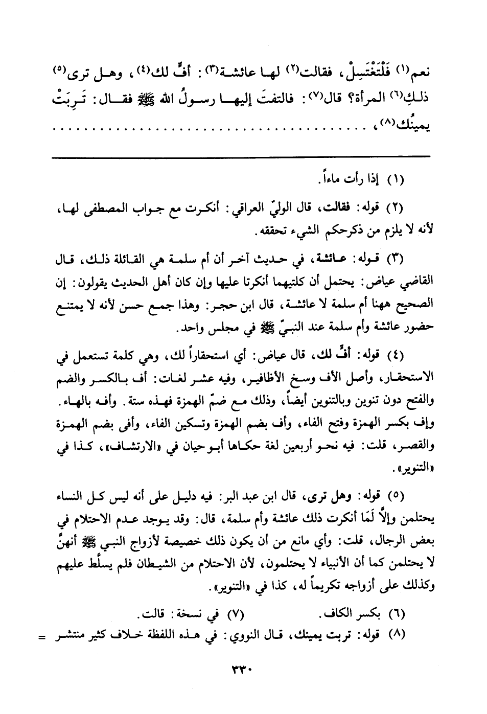 (¬5) قوله: وهل ترى، قال ابن عبد البر: فيه دليل على أنه ليس كل النساء يحتلمن وإلاَّ لَمَا أنكرت ذلك عائشة وأم سلمة، قال: وقد يوجد عدم الاحتلام في بعض الرجال، قلت: وأي مانع من أن يكون ذلك خصيصة لأزواج النبي صلّى الله عليه وسلّم أنهنَّ لا يحتلمن كما أن الأنبياء لا يحتلمون، لأن الاحتلام من الشيطان فلم يسلَّط عليهم وكذلك على أزواجه تكريماً له، كذا في "التنوير".