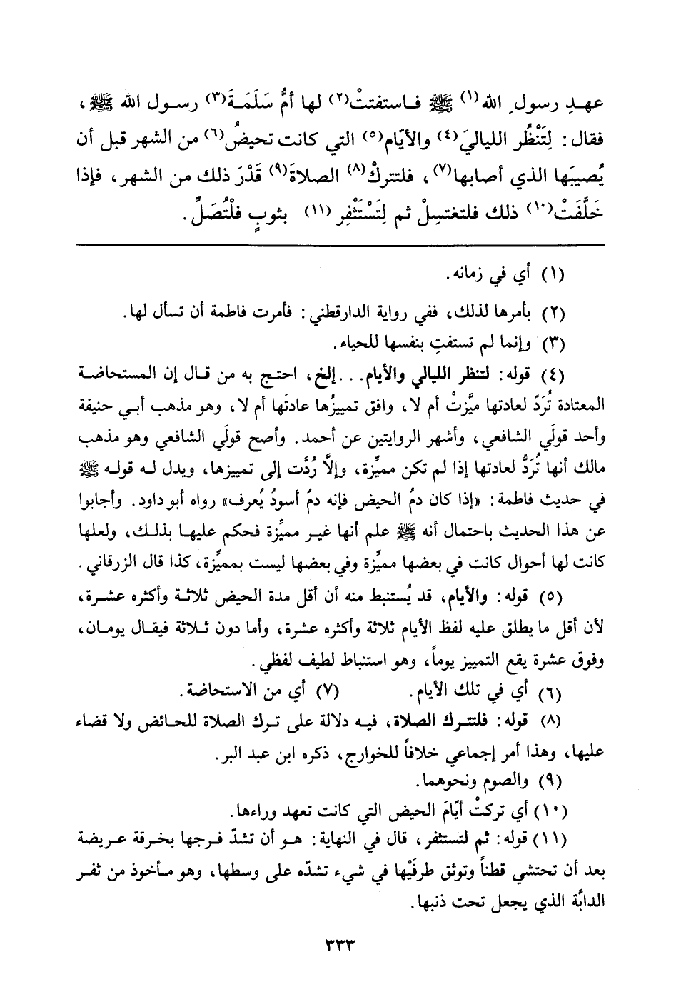 (¬11) قوله: ثم لتستثفر، قال في النهاية: هو أن تشدّ فرجها بخرقة عريضة بعد أن تحتشي قطناً وتوثق طرفَيْها في شيء تشدّه على وسطها، هو مأخوذ من ثفر الدابَّة الذي يجعل تحت ذنبها.