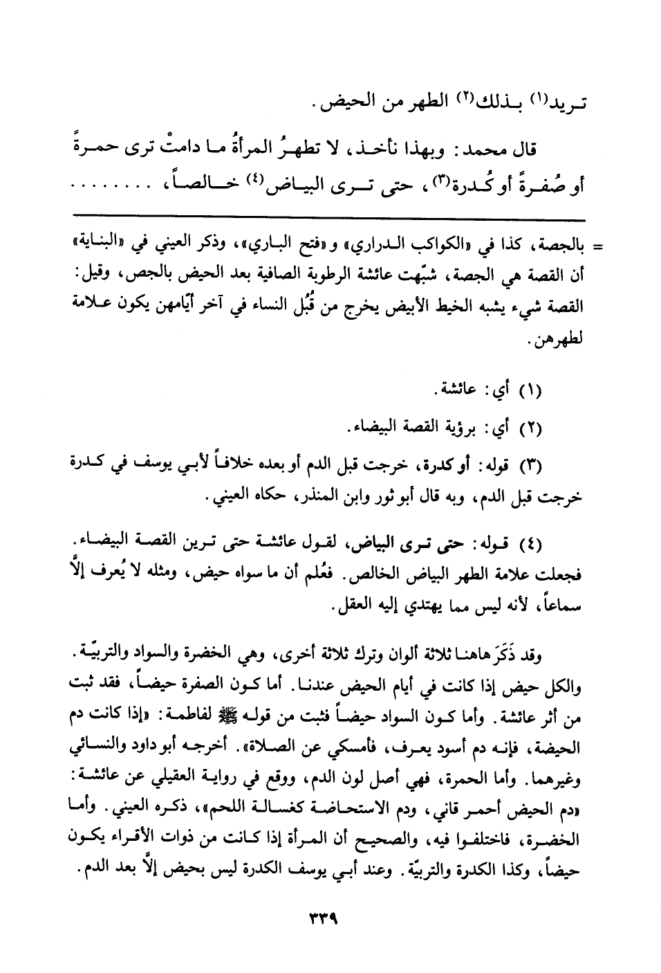 (¬4) قوله: حتى ترى البياض، لقول عائشة حتى ترين القصة البيضاء، فجعلت علامة الطهر البياض الخالص. فعُلم أن ما سواه حيض، ومثله لا يُعرف إلاَّ سماعاً، لأنه ليس مما يهتدي إليه العقل.