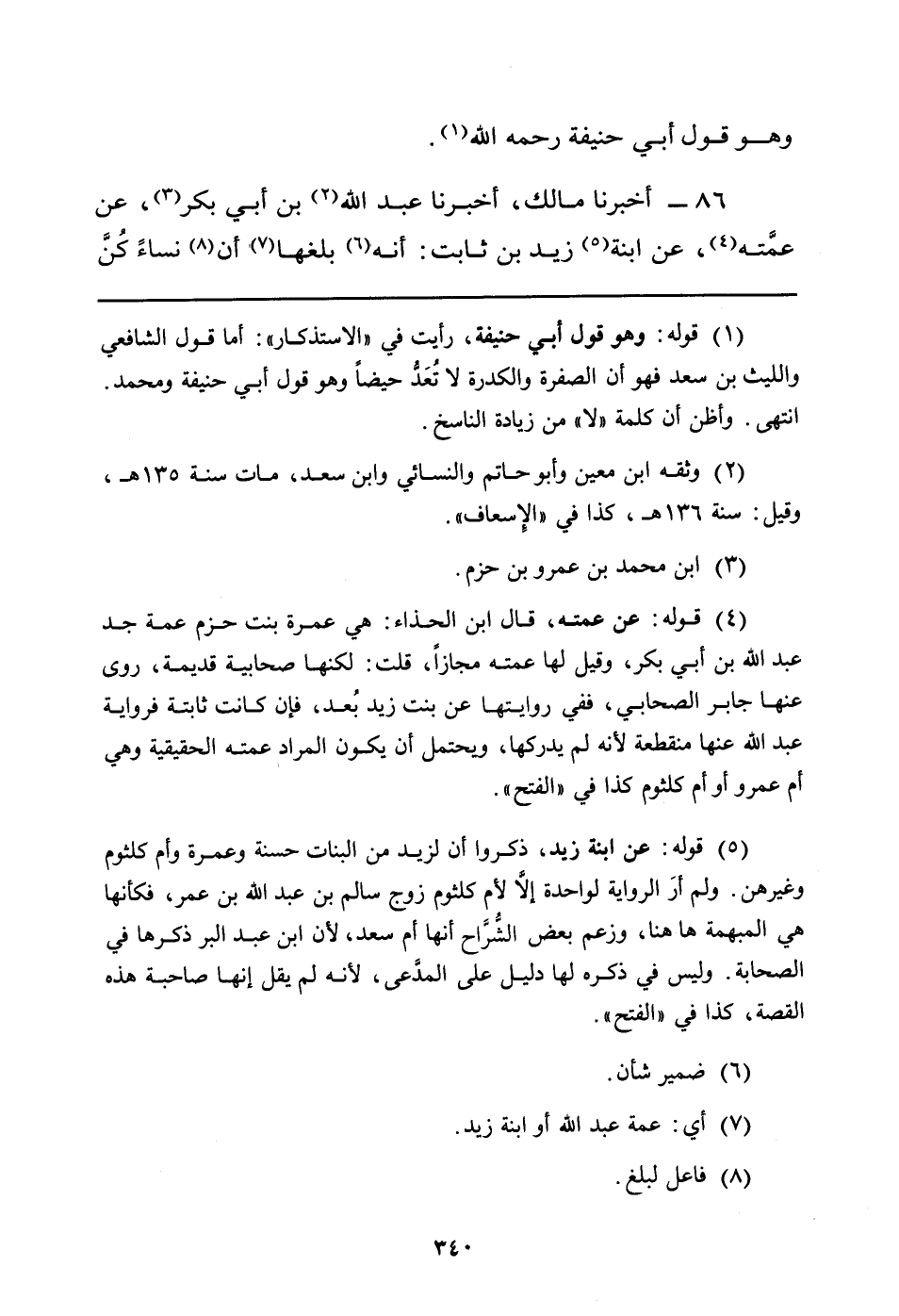 86 - أَخْبَرَنَا مالك، أخبرنا عبد الله (¬2) بن أبي بكر (¬3) ، عَنْ عمَّته (¬4) ، عَنِ ابْنَةِ (¬5) زَيْدِ بْنِ ثَابِتٍ: أنه (¬6) بلغها (¬7) أن (¬8) نساءً كُنَّ