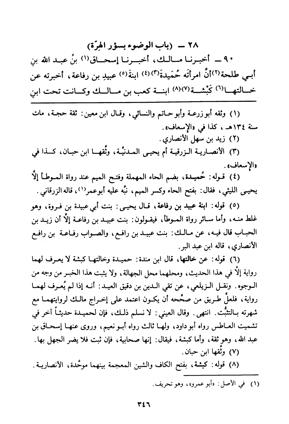 (¬5) قوله: ابنة عبيد بن رفاعة، قال يحيى: بنت أبي عبيدة بن فروة، وهو غلط منه، وأما سائر رواة الموطأ، فيقولون: بنت عبيد بن رفاعة إلاَّ أن زيد بن الحباب قال فيه، عن مالك: بنت عبيد بن رافع، والصواب رفاعة بن رافع الأنصاري، قاله ابن عبد البر.