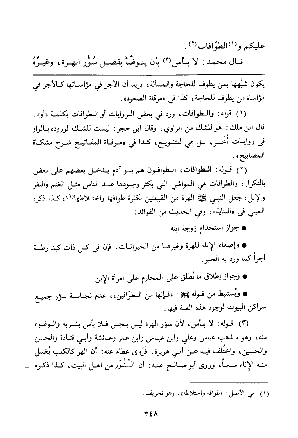 (¬2) قوله: الطوافات، الطوافون هم بنو آدم يدخل بعضهم على بعض بالتكرار، والطوافات هي المواشي التي يكثر وجودها عند الناس مثل الغنم والبقر والإِبل، جعل النبي صلّى الله عليه وسلّم الهرة من القبيلتين لكثرة طوافها واختلاطها (في الأصل: "طوافه واختلاطه"، وهو تحريف) ، كذا ذكره العيني في "البناية"، وفي الحديث من الفوائد: