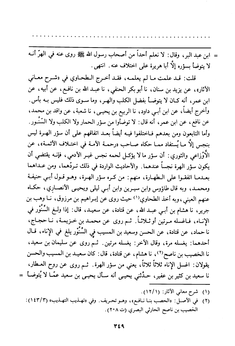 بفضله من الدوابّ، فقال: الكلب والخنزير والهرة، ثم قال بعد ما ذكر دليلاً عقلياً على الكراهة: فبهذا نأخذ وهو قول أبي حنيفة. انتهى. ومنهم من طهر من غير كراهة وهو قول مالك وغيره من أهل المدينة، والليث وغيره من أهل مصر، والأَوْزاعي وغيره من أهل الشام، والثوري ومن وافقه من أهل العراق، والشافعي وأصحابه وأحمد وإسحاق وأبي ثور وأبي عبيد، وعلقمة وعكرمة وإبراهيم وعطاء بن يسار، والحسن في ما روى عنه الأشعث، والثوري في ما روى عنه أبو عبد الله محمد بن نصر المروزي، كذا ذكره