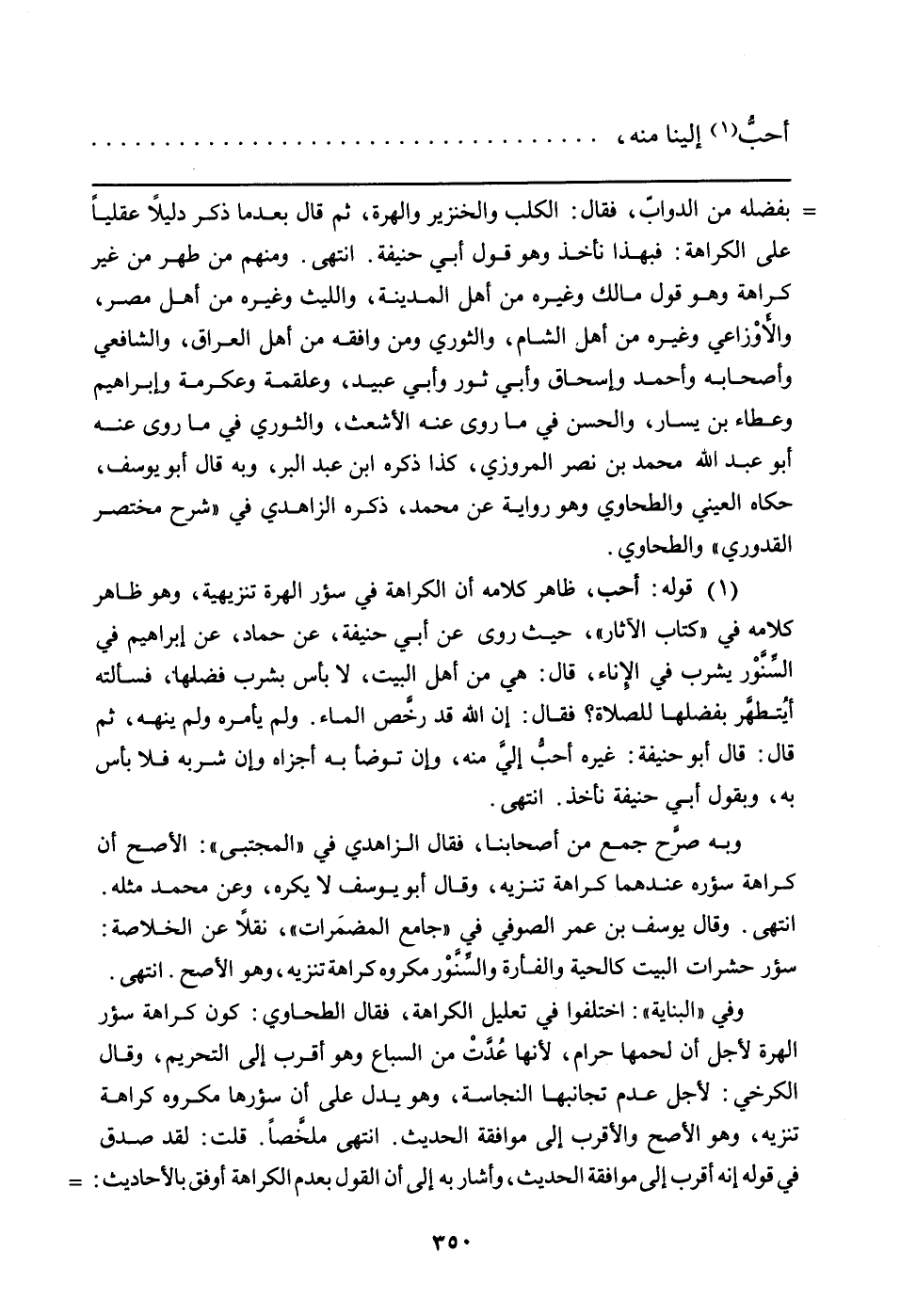 (¬1) قوله: أحب، ظاهر كلامه أن الكراهة في سؤر الهرة تنزيهية، وهو ظاهر كلامه في "كتاب الآثار"، حيث روى عن أبي حنيفة، عن حماد، عن إبراهيم في السِّنَّوْر يشرب في الإِناء، قال: هي من أهل البيت، لا بأس بشرب فضلها، فسألته أيُتطهَّر بفضلها للصلاة؟ فقال: إن الله قد رخَّص الماء. ولم يأمره ولم ينهه، ثم قال: قال أبو حنيفة: غيره أحبُّ إليَّ منه، وإن توضأ به أجزاه وإن شربه فلا بأس به، وبقول أبي حنيفة نأخذ. انتهى.