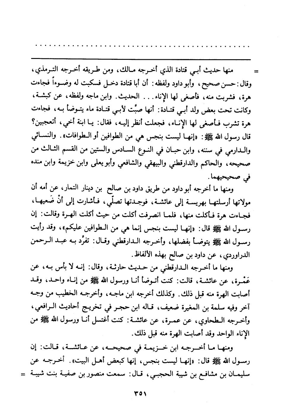 ومنها ما أخرجه أبو داود من طريق داود بن صالح بن دينار التمار، عن أمه أن مولاتها أرسلتها بهريسة إلى عائشة، فوجدتها تصلّي، فأشارت إلى أنْ ضَعيها، فجاءت هرة فأكلت منها، فلما انصرفت أكلت من حيث أكلت الهرة وقالت: إن رسول الله صلّى الله عليه وسلّم قال: إنها ليست بنجس إنما هي من الطوافين عليكم"، وقد رأيت رسول الله صلّى الله عليه وسلّم يتوضأ بفضلها، وأخرجه الدارقطني وقال: تفرَّد به عبد الرحمن الدراوردي، عن داود بن صالح بهذه الألفاظ.