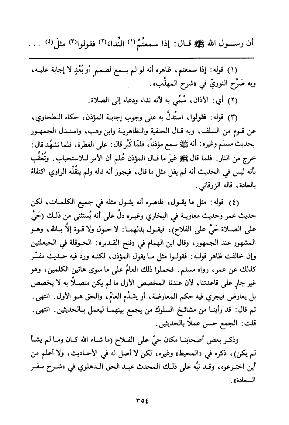 (¬4) قوله: مثل ما يقول، ظاهره أنه يقول مثله في جميع الكلمات، لكن حديث عمر وحديث معاوية في البخاري وغيره دلَّ على أنه يُستثنى من ذلك (حَيَّ على الصلاة حَيَّ على الفلاح) ، فيقول بدلهما: لا حول ولا قوة إلاَّ بالله، وهو المشهور عند الجمهور، وقال ابن الهمام في "فتح القدير": الحوقلة في الحيعلتين وإن خالفت ظاهر قوله: فقولوا مثل ما يقول المؤذن، لكنه ورد فيه حديث مفسّر كذلك عن عمر، رواه مسلم. فحملوا ذلك العامَّ على ما سوى هاتين الكلمتين، وهو غير جارٍ على قاعدتنا، لأن عندنا المخصص الأول ما لم يكن متصلاً به لا يخصص بل يعارض فيجري فيه حكم المعارضة، أو يقدَّم العامّ، والحق هو الأول. انتهى.
