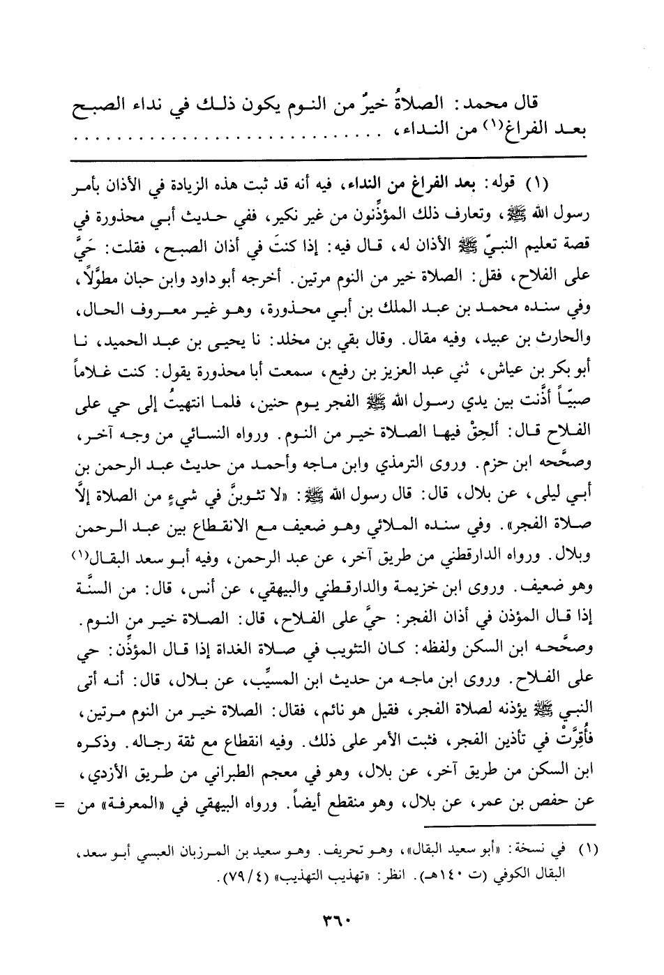 (¬1) قوله: بعد الفراغ من النداء، فيه أنه قد ثبت هذه الزيادة في الأذان بأمر رسول الله صلّى الله عليه وسلّم، وتعارف ذلك المؤذِّنون من غير نكير، ففي حديث أبي محذورة في قصة تعليم النبيّ صلّى الله عليه وسلّم الأذان له، قال فيه: إذا كنتَ في أذان الصبح، فقلت: حَيَّ على الفلاح، فقل: الصلاة خير من النوم مرتين. أخرجه أبو داود وابن حبان مطوَّلاً، وفي سنده محمد بن عبد الملك بن أبي محذورة، وهو غير معروف الحال، والحارث بن عبيد، وفيه مقال. وقال بقي بن مخلد: نا يحيى بن عبد الحميد، نا أبو بكر بن عياش، ثني عبد العزيز بن رفيع، سمعت أبا محذورة يقول: كنت غلاماً صبيّاً أذَّنت بين يدي رسول الله صلّى الله عليه وسلّم الفجر يوم حنين، فلما انتهيتُ إلى حي على الفلاح قال: ألحِقْ فيها الصلاة خير من النوم. ورواه النسائي من وجه آخر، وصحَّحه ابن حزم. وروى الترمذي وابن ماجه وأحمد من حديث عبد الرحمن بن أبي ليلى، عن بلال، قال قال رسول الله صلّى الله عليه وسلّم: "لا تثوبنَّ في شيءٍ من الصلاة إلاَّ صلاة الفجر". وفي سنده الملائي وهو ضعيف مع الانقطاع بين عبد الرحمن وبلال. ورواه الدارقطني من طريق آخر، عن عبد الرحمن، وفيه أبو سعد البقال (في نسخة: "أبو سعيد البقال"، وهو تحريف. وهو سعيد بن المرزبان العبسي أبو سعد، البقال الكوفي ت 140 هـ. انظر: "تهذيب التهذيب" 4/79) وهو ضعيف. وروى ابن خزيمة والدارقطني والبيهقي، عن أنس، قال: من السنَّة إذا قال المؤذن في أذان الفجر: حيَّ على الفلاح، قال: الصلاة خير من النوم. وصحَّحه ابن السكن ولفظه: كان التثويب في صلاة الغداة إذا قال المؤذِّن: حي على الفلاح. وروى ابن ماجه من حديث ابن المسيِّب، عن بلال، قال: أنه أتى النبي صلّى الله عليه وسلّم يؤذنه لصلاة الفجر، فقيل هو نائم، فقال: الصلاة خير من النوم مرتين، فأُقِرَّتْ في تأذين الفجر، فثبت الأمر على ذلك. وفيه انقطاع مع ثقة رجاله. وذكره ابن السكن من طريق آخر، عن بلال، وهو في معجم الطبراني من طريق الأزدي، عن حفص بن عمر، عن بلال، وهو منقطع أيضاً. ورواه البيهقي في "المعرفة" من