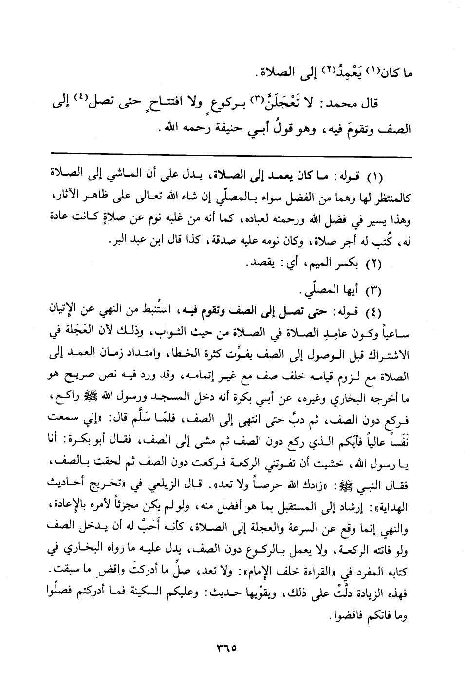 قَالَ مُحَمَّدٌ: لا تَعْجَلَنَّ (¬1) بركوعٍ وَلا افتتاحٍ حَتَّى تَصِلَ (¬2) إِلَى الصَّفِّ وتقومَ فِيهِ، وَهُوَ قولُ أبي حنيفة رحمه الله.