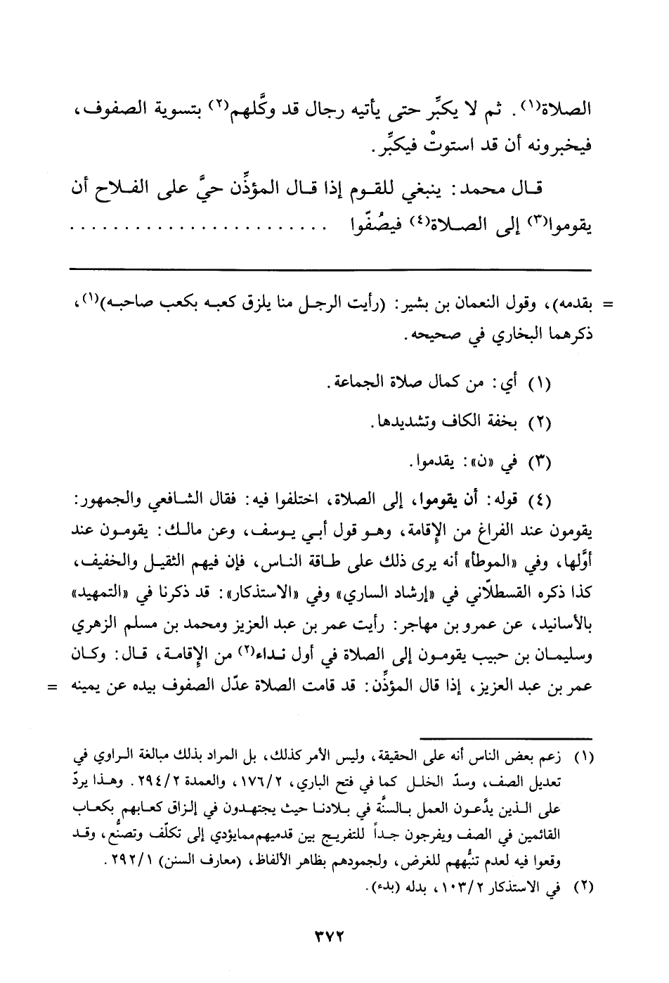بقدمه) ، وقول النعمان بن بشير: (رأيت الرجل منا يلزق كعبه بكعب صاحبه) (زعم بعض الناس أنه على الحقيقة، وليس الأمر كذلك، بل المراد بذلك مبالغة الراوي في تعديل الصف، وسدّ الخلل كما فتح الباري، 2/176، والعمدة 2/294. وهذا يردّ على الذين يدَّعون العمل بالسنَّة في بلادنا حيث يجتهدون في إلزاق كعابهم بكعاب القائمين في الصف ويفرجون جداً للتفريج بين قدميهم مما يؤدي إلى تكلّف وتصنُّع، وقد وقعوا فيه لعدم تنبُّههم للغرض، ولجمودهم بظاهر الألفاظ، (معارف السنن) 1/292) ، ذكرهما البخاري في صحيحه.
