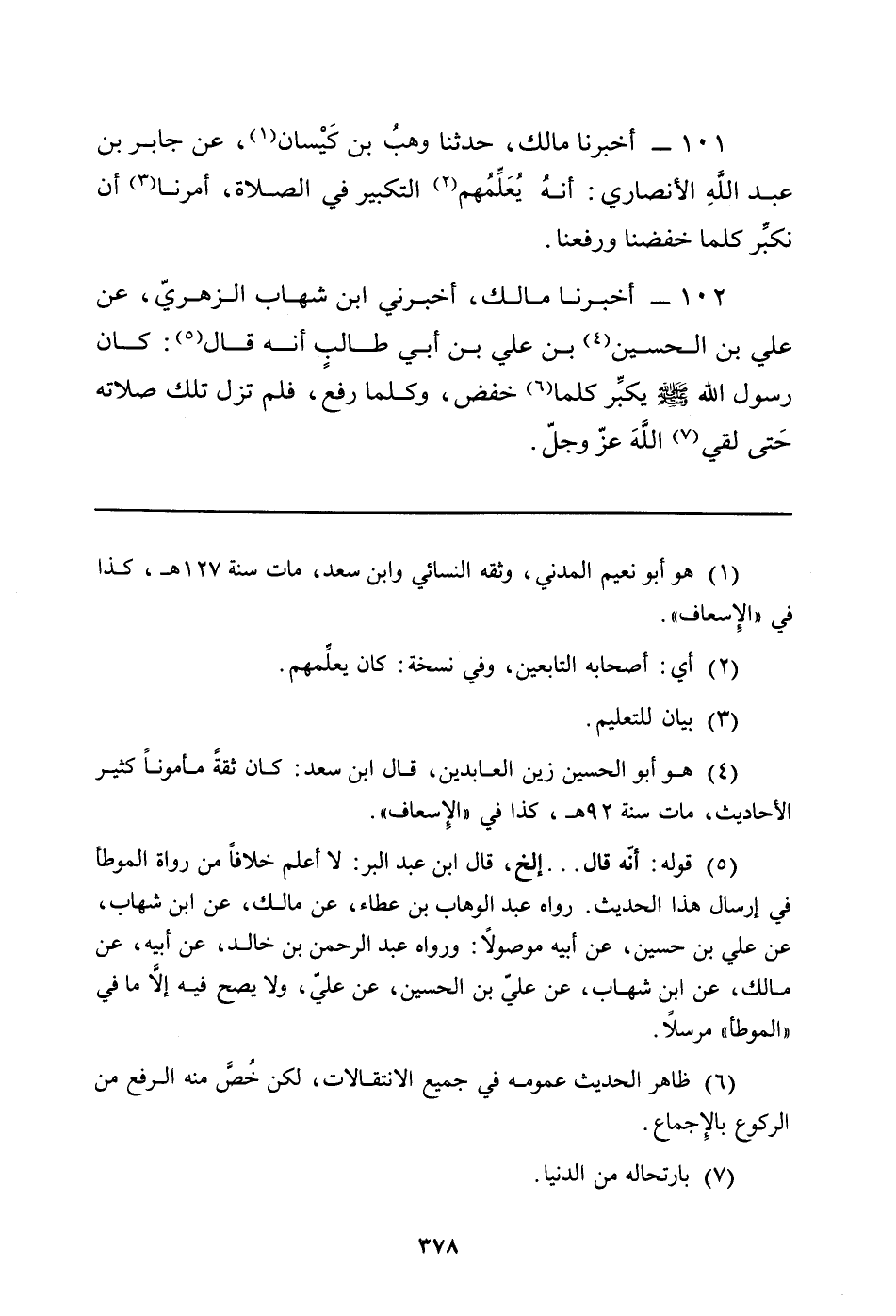 102 - أَخْبَرَنَا مَالِكٌ، أَخْبَرَنِي ابْنُ شِهَابٍ الزُّهْرِيُّ، عَنْ عَلِيِّ بْنِ الْحُسَيْنِ (¬4) بْنِ عَلِيِّ بْنِ أَبِي طالبٍ أَنَّهُ قَالَ (¬5) : كَانَ رَسُولُ اللَّهِ صَلَّى اللَّهُ عَلَيْهِ وَسَلَّمَ يكبِّر كُلَّمَا (¬6) خَفَضَ، وَكُلَّمَا رَفَعَ، فَلَمْ تَزَلْ تِلْكَ صَلاتُهُ حَتى لقي (¬7) اللَّهَ عزّ وجلّ.