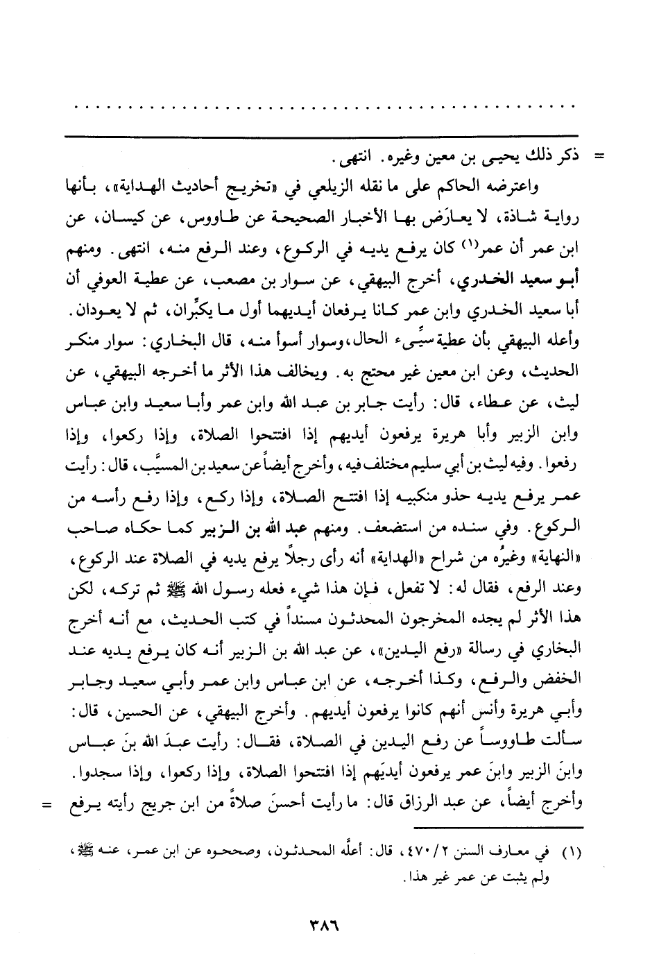 واعترضه الحاكم على ما نقله الزيلعي في "تخريج أحاديث الهداية"، بأنها رواية شاذه، لا يعارَض بها الأخبار الصحيحة عن طاووس، عن كيسان، عن ابن عمر أن عمر (في معارف السنن 2/470، قال: أعله المحدثون، وصححوه عن ابن عمر، عنه صلى الله عليه وسلم، ولم يثبت عن عمر غير هذا) كان يرفع يديه في الركوع، وعند الرفع منه، انتهى. ومنهم أبو سعيد الخدري، وأخرج البيهقي، عن سوار بن مصعب، عن عطية العوفي أن أبا سعيد الخدري وابن عمر كانا يرفعان أيديهما أول ما يكبِّران، ثم لا يعودان. وأعله البيهقي بأن عطية سيِّئ الحال، وسوار أسوأ منه، قال البخاري: سوار منكر الحديث، وعن ابن معين غير محتج به. ويخالف هذا الأثر ما أخرجه البيهقي، عن ليث، عن عطاء، قال: رأيت جابر بن عبد الله وابن عمر وأبا سعيد وابن عباس وابن الزبير وأبا هريرة يرفعون أيديهم إذا افتتحوا الصلاة، وإذا ركعوا، وإذا رفعوا. وفيه ليث بن أبي سليم مختلف فيه، وأخرج أيضاً عن سعيد بن المسيَّب، قال: رأيت عمر يرفع يديه حذو منكبيه إذا افتتح الصلاة، وإذا ركع، وإذا رفع رأسه من الركوع. وفي سنده من استضعف. ومنهم عبد الله بن الزبير كما حكاه صاحب "النهاية" وغيرُه من شراح "الهداية" أنه رأى رجلاً يرفع يديه في الصلاة عند الركوع، وعند الرفع، فقال له: لا تفعل، فإن هذا شيء فعله رسول الله صلى الله عليه وسلم ثم تركه، لكن هذا الأثر لم يجده المخرجون المحدثون مسنداً في كتب الحديث، مع أنه أخرج البخاري في رسالة "رفع اليدين"، عن عبد الله بن الزبير أنه كان يرفع يديه عند الخفض والرفع، وكذا أخرجه، عن ابن عباس وابن عمر وأبي سعيد وجابر وأبي هريرة وأنس أنهم كانوا يرفعون أيديهم. وأخرج البيهقي، عن الحسين، قال: سألت طاووساً عن رفع اليدين في الصلاة، فقال: رأيت عبدَ الله بنَ عباس وابنَ الزبير وابنَ عمر يرفعون أيديهم إذا افتتحوا الصلاة، وإذا ركعوا، وإذا سجدوا. وأخرج أيضاً، عن عبد الرزاق قال: ما رأيت أحسنَ صلاةً من ابن جريج رأيته يرفع
