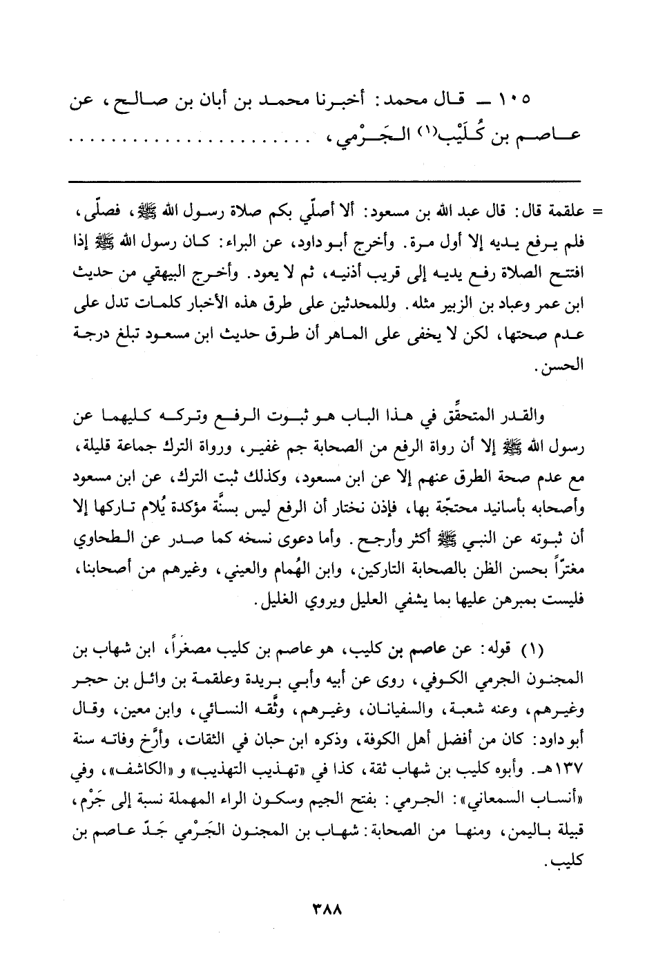 105 - قَالَ مُحَمَّدٌ: أَخْبَرَنَا مُحَمَّدُ بْنُ أَبَانَ بْنِ صالح، عن عاصم بن كٌلَيْب (¬1) الجَرْمي،