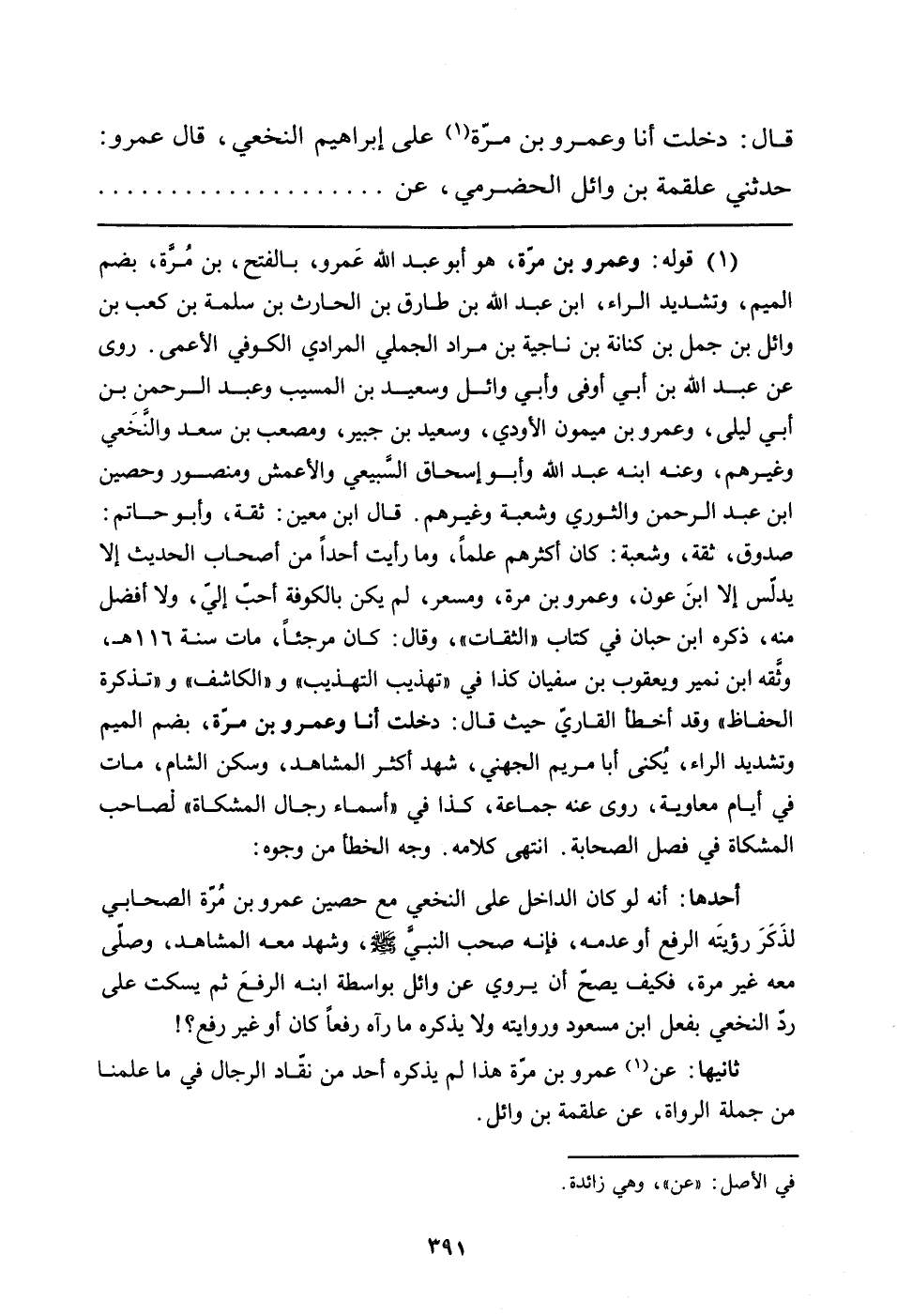 ثانيها: عن (في الأصل: "عن"، وهي زائدة) عمرو بن مرّة هذا لم يذكره أحد من نقّاد الرجال في ما علمنا من جملة الرواة، عن علقمة بن وائل.