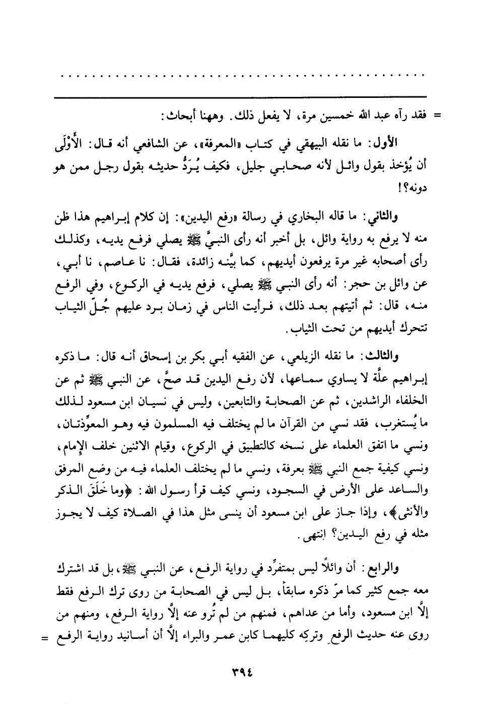والرابع: أن وائلاً ليس بمتفرِّد في رواية الرفع، عن النبي صلى الله عليه وسلم، بل قد اشترك معه جمع كثير كما مرّ ذكره سابقاً، بل ليس في الصحابة من روى ترك الرفع فقط إلاّ ابن مسعود، وأما من عداهم، فمنهم من لم تُرو عنه إلاّ رواية الرفع، ومنهم من روى عنه حديث الرفعِ وتركِه كليهما كابن عمر والبراء إلاَّ أن أسانيد رواية الرفع