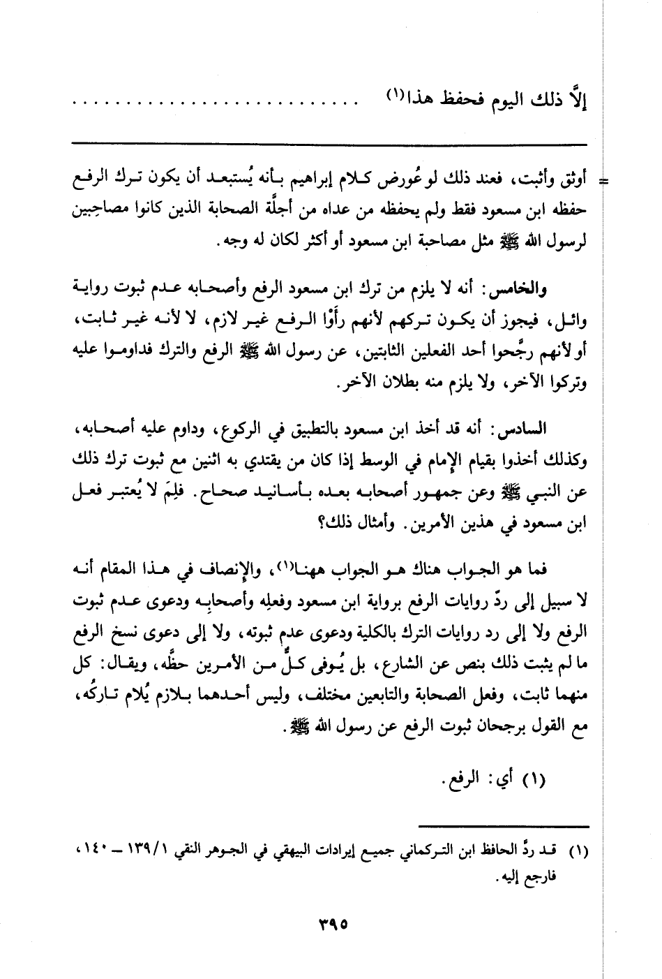 فما هو الجواب هناك هو الجواب ههنا (قد ردَّ الحافظ ابن التركماني جميع إيرادات البيهقي في الجوهر النقي 1/139 - 140، فارجع إليه) ، والإنصاف في هذا المقام أنه لا سبيل إلى ردّ روايات الرفع برواية ابن مسعود وفعلِه وأصحابه ودعوى عدم ثبوت الرفع ولا إلى رد روايات الترك بالكلية ودعوى عدم ثبوته، ولا إلى دعوى نسخ الرفع ما لم يثبت ذلك بنص عن الشارع، بل يُوفى كلٌّ من الأمرين حظّه، ويقال: كل منهما ثابت، وفعل الصحابة والتابعين مختلف، وليس أحدهما بلازم يُلام تاركه، مع القول برجحان ثبوت الرفع عن رسول الله صلى الله عليه وسلم.