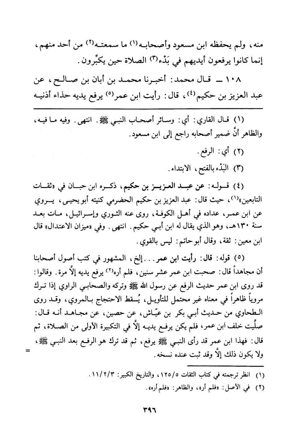 108 - قَالَ مُحَمَّدٌ: أَخْبَرَنَا مُحَمَّدُ بْنُ أَبَانَ بْنِ صَالِحٍ، عَنْ عَبْدِ الْعَزِيزِ بْنِ حَكِيمٍ (¬4) ، قَالَ: رَأَيْتُ ابن عمر (¬5) يرفع يديه حذاء أذنيه