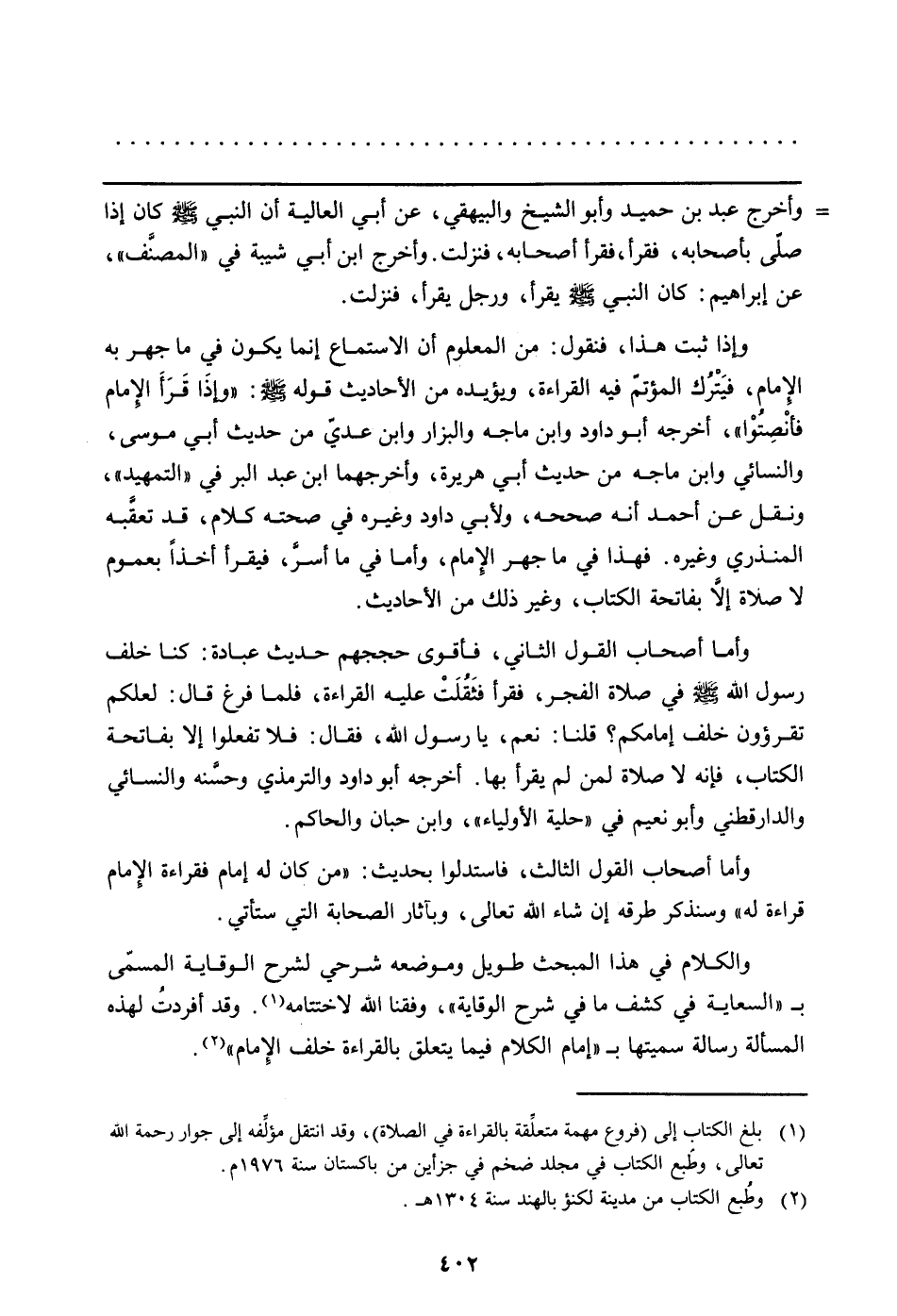 والكلام في هذا المبحث طويل وموضعه شرحي لشرح الوقاية المسمَّى بـ"السعاية في كشف ما في شرح الوقاية"، وفقنا الله لاختتامه (بلغ الكتاب إلى (فروع مهمة متعلِّقة بالقراءة في الصلاة) ، وقد انتقل مؤلِّفه إلى جوار رحمة الله تعالى، وطبع الكتاب في مجلد ضخم في جزأين من باكستان سنة 1976 م) . وقد أفردتُ لهذه المسألة رسالة سميتها بـ "إمام الكلام فيما يتعلق بالقراءة خلف الإمام"
