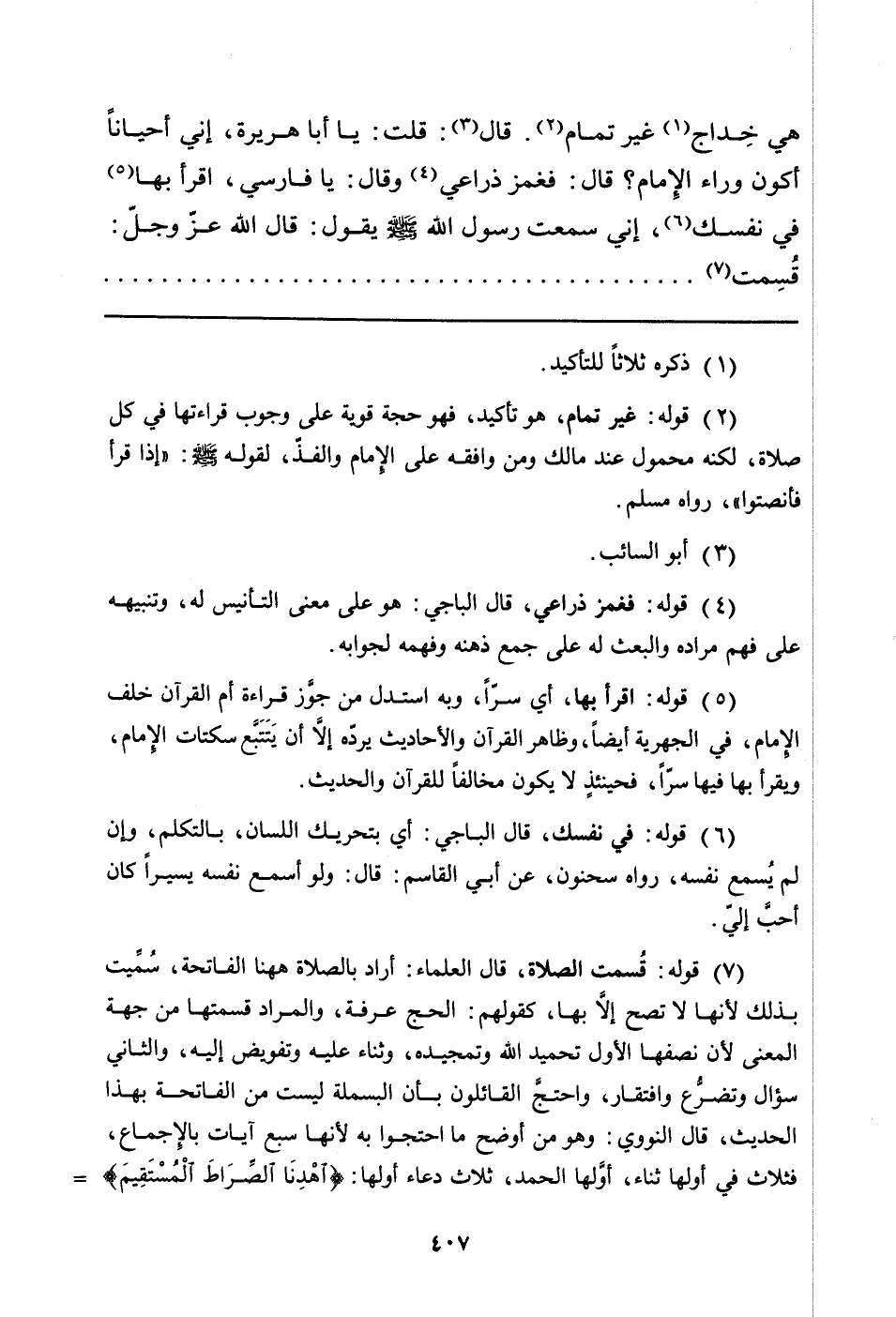 غَيْرُ تَمَامٍ (¬1) . قَالَ (¬2) : قُلْتُ: يَا أَبَا هُرَيْرَةَ، إِنِّي أَحْيَانًا أَكُونُ وَرَاءَ الإِمَامِ؟ قَالَ: فَغَمَزَ ذِرَاعِي (¬3) وَقَالَ: يَا فَارِسِيُّ، اقْرَأْ بِهَا (¬4) فِي نَفْسِكِ (¬5) ، إِنِّي سَمِعْتُ رَسُولَ اللَّهِ صَلَّى اللَّهُ عَلَيْهِ وَسَلَّمَ يَقُولُ: قَالَ اللَّهُ عَزَّ وَجَلَّ قُسِمت (¬6)