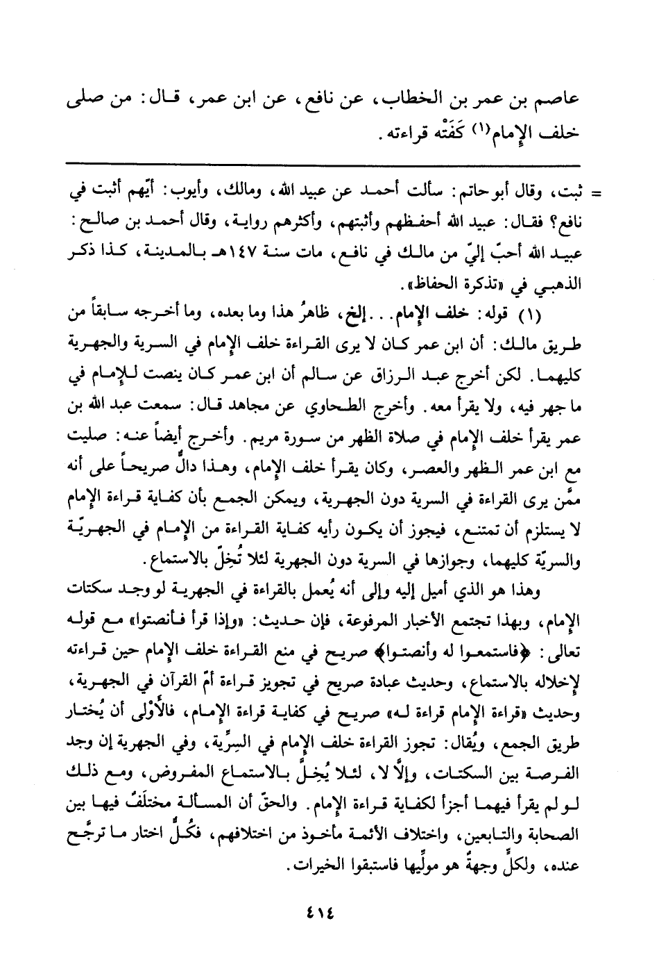 عَاصِمِ بْنِ عُمَرَ بْنِ الْخَطَّابِ، عَنْ نَافِعٍ، عَنِ ابْنِ عُمَرَ، قَالَ: مَنْ صَلَّى خَلْفَ الإمام (¬1) كَفَتْه قراءته.