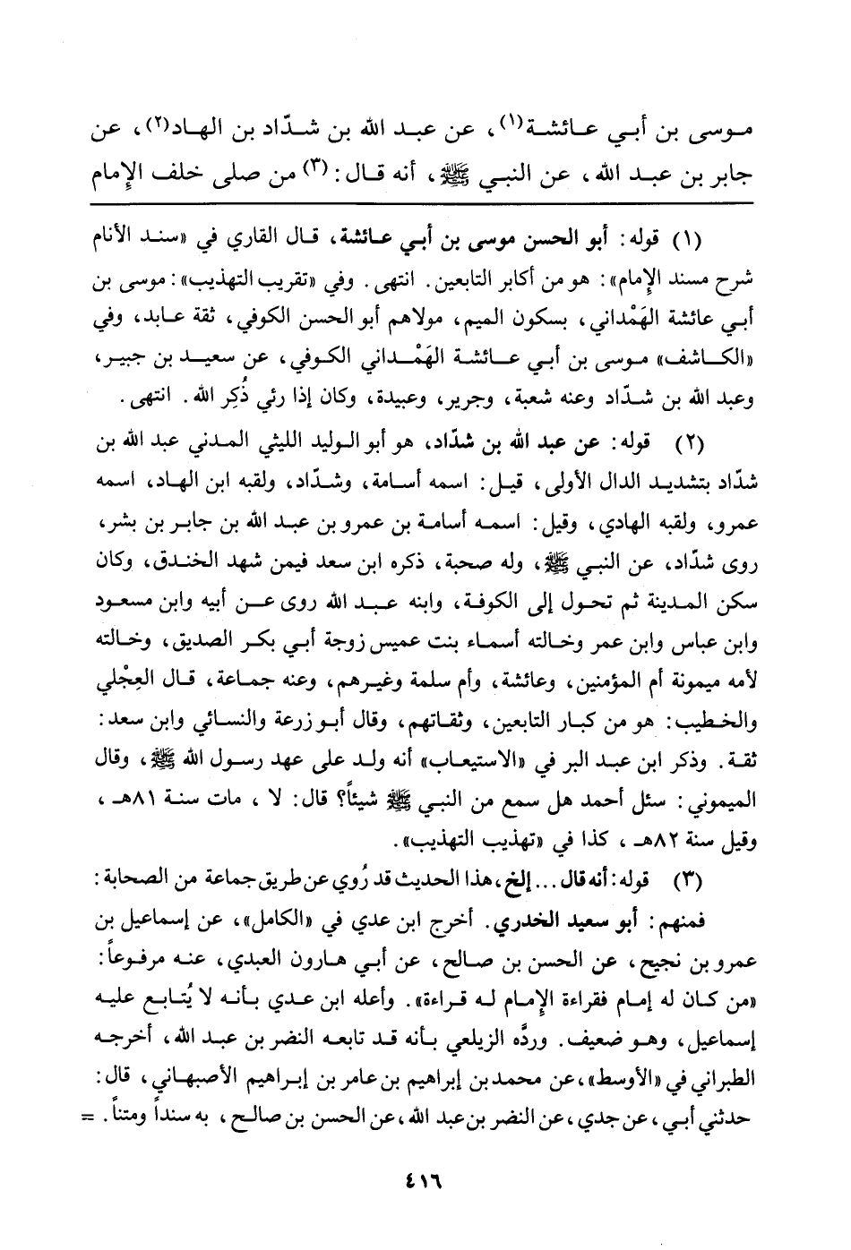 (¬1) قوله: أبو الحسن موسى بن أبي عائشة، قال القاري في"سند الأنام شرح مسند الإمام": وهو من أكابر التابعين. انتهى. وفي "تقريب التهذيب": موسى بن أبي عائشة الهَمداني، بسكون الميم، مولاهم أبو الحسن الكوفي، ثقة عابد، وفي"الكاشف" موسى بن أبي عائشة الهَمداني الكوفي، عن سعيد بن جبير، وعبد الله بن شدّاد وعنه شعبة وجرير، وعبيدة، وكان إذا رئي ذُكرَ الله. انتهى.