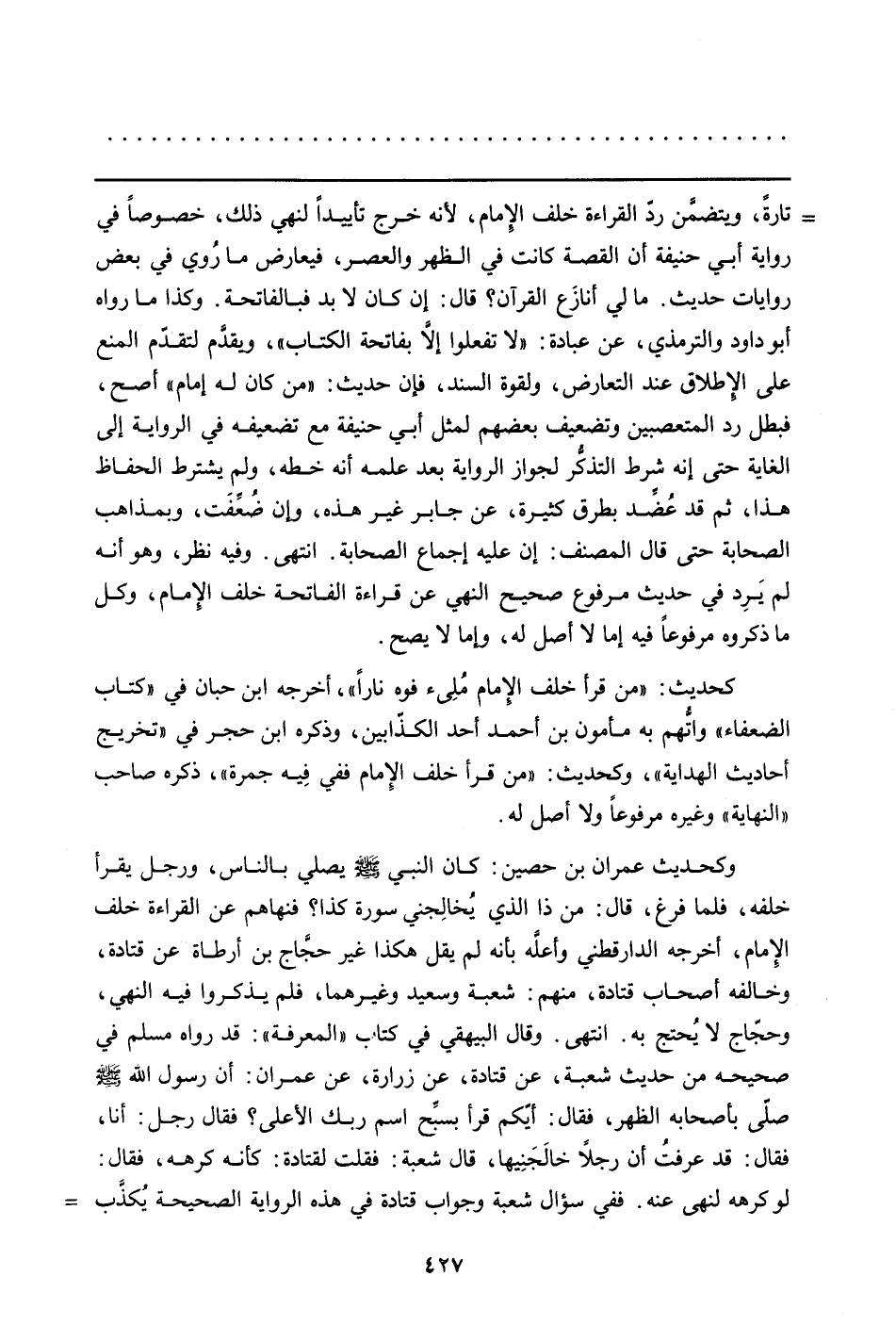 تارةً، ويتضمَّن ردّ القراءة خلف الإمام، لأنه خرج تأييداً لنهي ذلك، خصوصاً في رواية أبي حنيفة أن القصة كانت في الظهر والعصر، فيعارض ما رُوي في بعض روايات حديث. ما لي أنازَع القرآن؟ قال: إن كان لا بد فبالفاتحة. وكذا ما رواه أبو داود والترمذي، عن عبادة: "ولا تفعلوا إلاَّ بفاتحة الكتاب"، يقدَّم لتقدّم المنع على الإطلاق عند التعارض، ولقوة السند، فإن حديث: "من كان له إمام" أصح، فبطل رد المتعصبين وتضعيف بعضهم لمثل أبي حنيفة مع تضعيفه في الرواية إلى الغاية حتى إنه شرط التذكُّر لجواز الرواية بعد علمه أنه خطه، ولم يشترط الحفاظ هذا، ثم قد عُضِّد بطرق كثيرة، عن جابر غير هذه، وإن ضُعِّفت، وبمذاهب الصحابة حتى قال المصنف: إن عليه إجماع الصحابة. انتهى. وفيه نظر، وهو أنه لم يَرِد في حديث مرفوع صحيح النهي عن قراءة الفاتحة خلف الإمام، وكل ما ذكروه مرفوعاً فيه إما لا أصل له، وإما لا يصح.