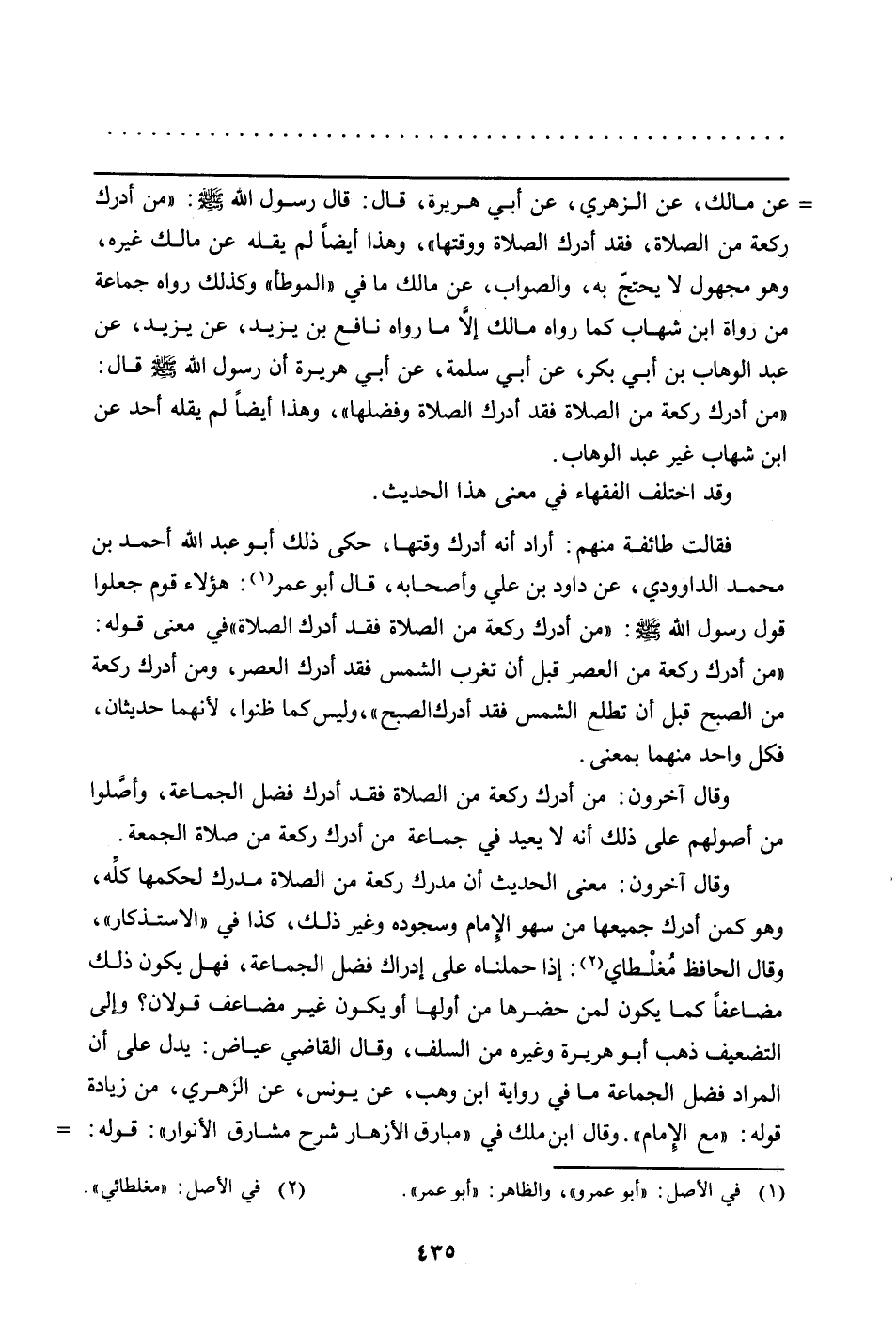 عن مالك، عن الزهري، عَنْ أَبِي هُرَيْرَةَ، قَالَ: قَالَ رَسُولُ اللَّهِ صلى الله عليه وسلم: "من أدرك ركعة من الصلاة، فقد أدرك الصلاة ووقتها"، وهذا أيضاً لم يقله عن مالك غيره، وهو مجهول لا يحتجّ به، والصواب، عن مالك ما في "الموطأ" وكذلك رواه جماعة من رواة ابن شهاب كما رواه مالك إلا ما رواه نافع بن يزيد، عن يزيد، عن عبد الوهاب بن أبي بكر، عن أبي سلمة، عن أبي هريرة أن رسول الله صلى الله عليه وسلم قال: "من أدرك ركعة من الصلاة فقد أدرك الصلاة وفضلها:، وهذ أيضاً لم يقله أحد عن ابن شهاب غير عبد الوهاب.