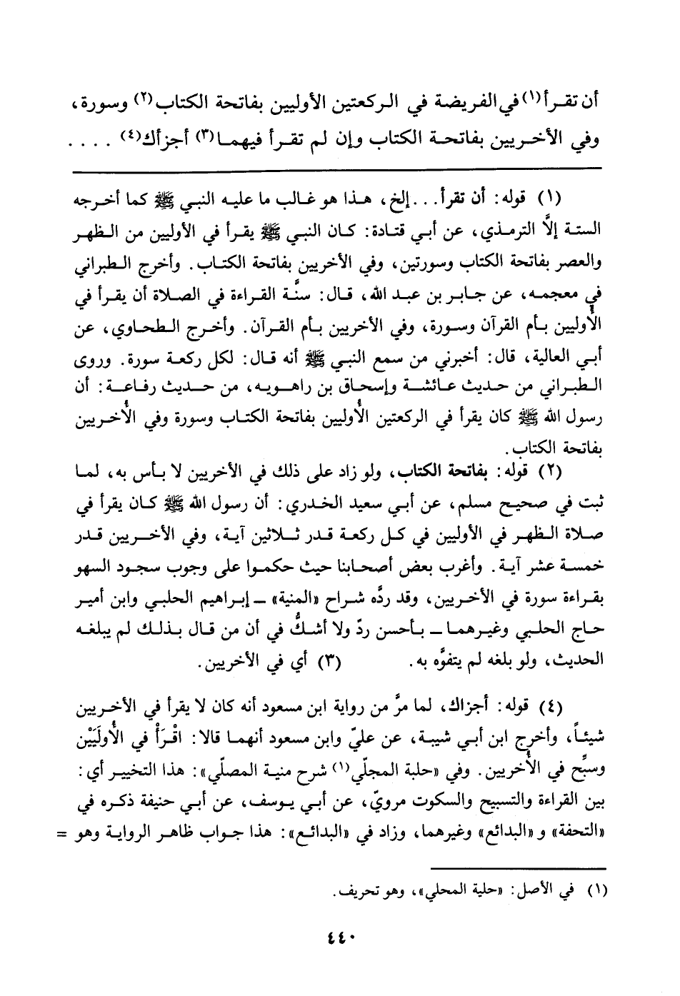 (¬2) قوله: بفاتحة الكتاب، ولو زاد على ذلك في الأخريين لا بأس به، لما ثبت في صحيح مسلم، عن أبي سعيد الخدري: أن رسول الله صلى الله عليه وسلم كان يقرأ في صلاة الظهر في الأوليين في كل ركعة قدر ثلاثين آية، وفي الأخريين قدر خمسة عشر آية. وأغرب بعض أصحابنا حيث حكموا على وجوب سجود السهو بقراءة سورة في الأخريين، وقد ردَّه شراح "المنية" - إبراهيم الحلبي وابن أمير حاج الحلبي وغيرهما - بأحسن ردّ ولا أشكُّ في أن من قال بذلك لم يبلغه الحديث، ولو بلغه لم يتفوَّه به.