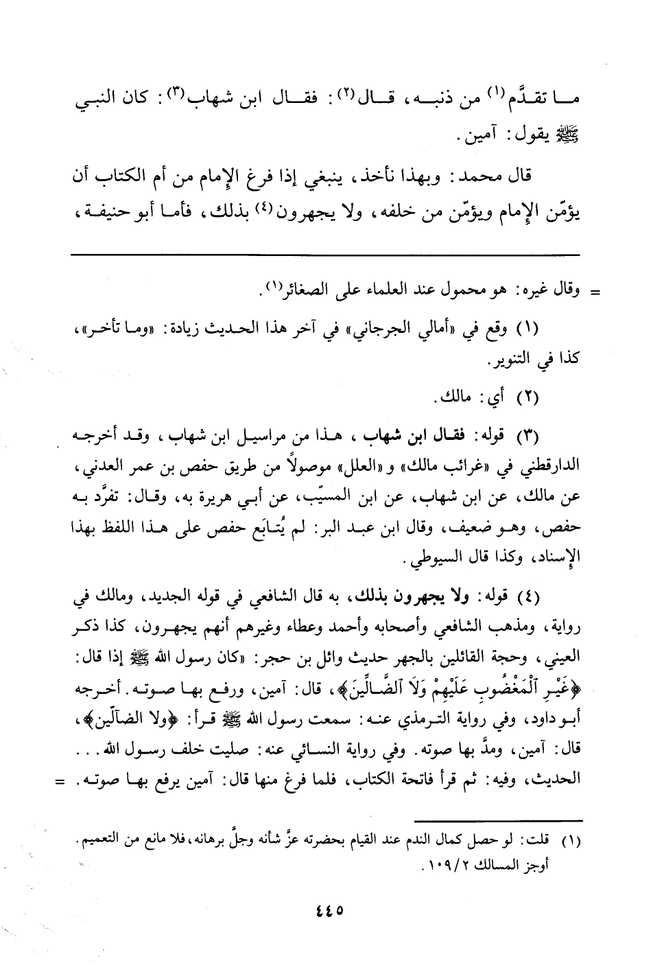 قَالَ مُحَمَّدٌ: وَبِهَذَا نَأْخُذُ، يَنْبَغِي إِذَا فَرَغَ الإِمَامُ مِنْ أُمِّ الْكِتَابِ أَنْ يُؤَمِّنَ الإِمَامُ وَيُؤَمِّنَ مَنْ خَلْفَهُ، وَلا يَجْهَرُونَ (¬4) بذلك، فأما أبو حنيفة،