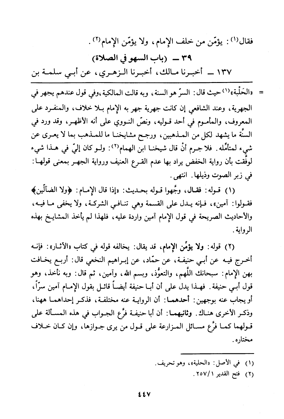 (¬1) قوله: فقال، وجَّهوا قوله بحديث: "إذا قال الإمام: {وَلاَ الضَّالِّينَ} فقولوا: آمين"، فإنه يدل على القسمة وهو تنافي الشركة، ولا يخفى ما فيه، والأحاديث الصريحة في قول الإمام آمين واردة عليه، فلهذا لم يأخذ المشايخ بهذه الرواية.