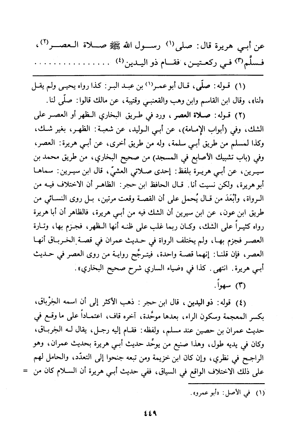 (¬2) قوله: صلاة العصر، ورد في طريق البخاري الظهر أو العصر على الشك، وفي (أبواب الإمامة) ، عن أبي الوليد، عن شعبة: الظهر، بغير شك، وكذا لمسلم من طريق أبي سلمة، وله من طريق آخرى، عن أبي هريرة: العصر وفي (باب تشبيك الأصابع في المسجد) من صحيح البخاري، من طريق محمد بن سيرين، عن أبي هريرة بلفظ: إحدى صلاتي العشيّ، قال ابن سيرين: سماها أبو هريرة، ولكن نسيت أنا. قال الحافظ ابن حجر: الظاهر أن الاختلاف فيه من الرواة، وأبعَدَ من قال يُحمل على أن القصة وقعت مرتنين، بل روى النسائي من طريق ابن عون، عن ابن سيرين أن الشك فيه من أبي هريرة، فالظاهر أن أبا هريرة رواه كثيراً على الشك، وكان ربما غلب على ظنه أنها الظهر، فجزم بها، وتارة العصر فجزم بها، ولم يختلف الرواة في حديث عمران في قصة الخرباق أنها العصر، فإن قلنا: إنهما قصة واحدة، فيترجَّح رواية من روى العصر في حديث أبي هريرة. انتهى. كذا في "ضياء الساري شرح صحيح البخاري".