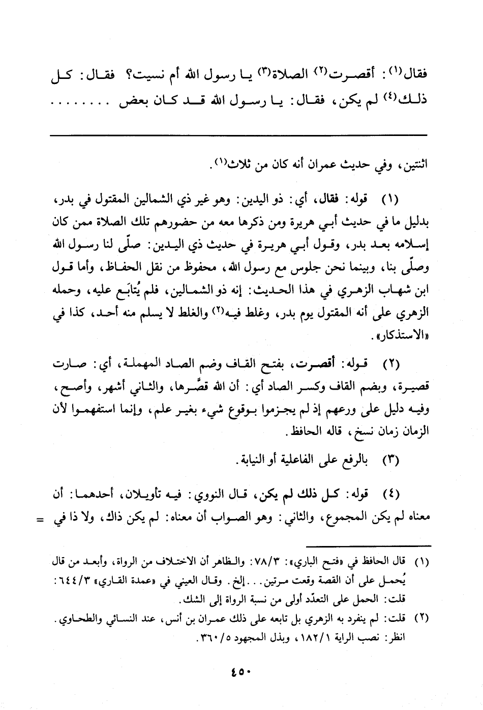 (¬4) قوله: كل ذلك لم يكن، قال النووي: فيه تأويلان، أحدهما: أن معناه لم يكن المجموع، والثاني: وهو الصواب أن معناه: لم يكن ذاك، ولا ذا في