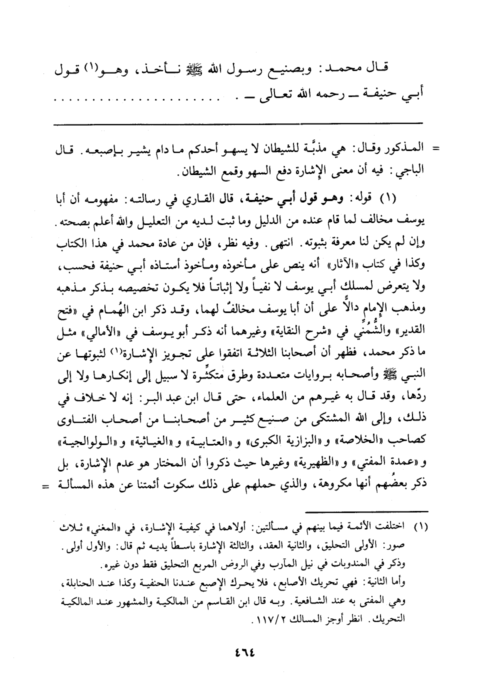 (¬1) قوله: وهو قول أبي حنيفة، قال القاري في رسالته: مفهومه أن أبا يوسف مخالف لما قام عنده من الدليل وما ثبت لديه من التعليل والله أعلم بصحته. وإن لم يكن لنا معرفة بثبوته. انتهى. وفيه نظر، فإن من عادة محمد في هذا الكتاب وكذا في كتاب "الآثار" أنه ينص على مأخوذه ومأخوذ أستاذه أبي حنيفة فحسب، ولا يتعرض لمسلك أبي يوسف لا نفياً ولا إثباتاً فلا يكون تخصيصه بذكر مذهبه ومذهب الإمام دالاً على أن أبا يوسف مخالفٌ لهما، وقد ذكر ابن الهُمام في "فتح القدير" والشُّمُنِّي في "شرح النقاية" وغرهما أنه ذكر أبو يوسف في "الأمالي" مثل ما ذكر محمد، فظهر أن أصحابنا الثلاثة اتفقوا على تجويز الإشارة (اختلفت الأئمة فيما بينهم في مسألتين: أولاهما في كيفية الإشارة، في "المغني" ثلاث صور: الأولى التحليق، والثانية العقد، والثالثة الإشارة باسطاً يديه ثم قال: والأول أولى وذكر في المندوبات في نيل المآرب وفي الروض المربع التحليق فقط دون غيره وأما الثانية: فهي تحريك الأصابع، فلا يحرك الإصبع عندنا الحنفية وكذا عند الحنابلة، وهي المفتى به عند الشافعية. وبه قال ابن القاسم من المالكية والمشهور عند المالكية التحريك. انظر أوجز المسالك 2/117) لثبوتها عن النبي صلى الله عليه وسلم وأصحابه بروايات متعددة وطرق متكثِّرة لا سبيل إلى إنكارها ولا إلى ردّها، وقد قال به غيرهم من العلماء، حتى قال ابن عبد البر: إنه لا خلاف في ذلك، وإلى الله المشتكى من صنيع كثير من أصحابنا من أصحاب الفتاوى كصاحب "الخلاصة" و"البزازية الكبرى" و"العتابية" و"الغياثية" و"الولوالجية" و"عمدة المفتي" و"الظهيرية" وغيرها حيث ذكروا أن المختار هو عدم الإشارة، بل ذكر بعضهم أنها مكروهة، والذي حملهم على ذلك سكوت أئمتنا عن هذه المسألة