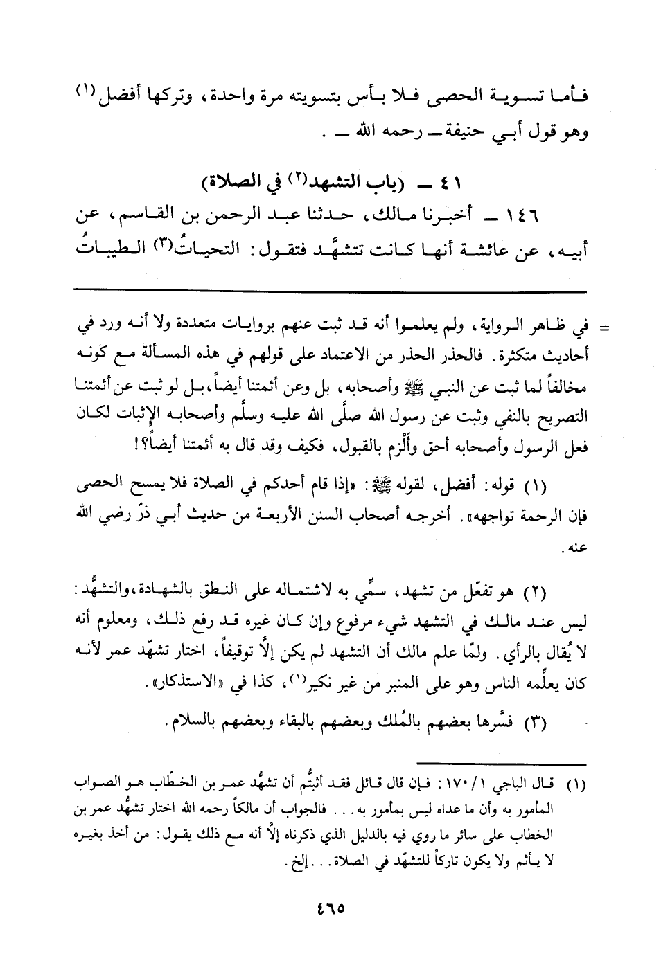 (¬2) هو تفعّل من تشهد، سمِّي به لاشتماله على النطق بالشهادة، والتشهُّد: ليس عند مالك في التشهد شيء مرفوع وإن كان غيره قد رفع ذلك، ومعلوم أنه لا يقال بالرأي. ولمّا علم مالك أن التشهد لم يكن إلاَّ توقيفاً، اختار تشهد عمر لأنه كان يعلِّمه الناس وهو على المنبر من غير نكير (قال الباجي 1/170: فإن قال قائل فقد أثبتم أن تشهد عمر بن الخطاب هو الصواب المأمور به وأن ما عداه ليس بمأمور به..فالجواب أن مالكاً رحمه الله اختار تشهُّد عمر بن الخطاب على سائر ما روي فيه بالدليل الذي ذكرناه إلاَّ أنه مع ذلك يقول: من أخذ بغيره لا يأثم ولا يكون تاركاً للتشهد في الصلاة ... إلخ) ، كذا في "الاستذكار".
