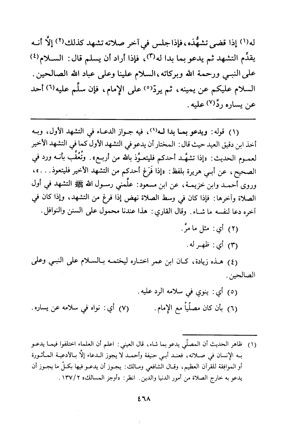 لَهُ (¬1) إِذَا قَضَى تشهُّدَه، فَإِذَا جَلَسَ فِي آخِرِ صَلاتِهِ تَشَهَّدَ كَذَلِكَ (¬2) إلاَّ أَنَّهُ يقدِّم التَّشَهُّدَ ثُمَّ يَدْعُو بِمَا بَدَا لَهُ (¬3) ، فَإِذَا أَرَادَ أَنْ يُسَلِّمَ قَالَ: السَّلامُ (¬4) عَلَى النَّبِيِّ وَرَحْمَةُ اللَّهِ وَبَرَكَاتُهُ، السَّلامُ عَلَيْنَا وَعَلَى عِبَادِ اللَّهِ الصَّالِحِينَ. السَّلامُ عَلَيْكُمْ عَنْ يَمِينِهِ، ثُمَّ يَرُدُّ (¬5) عَلَى الإِمَامِ، فَإِنْ سلَّم عَلَيْهِ (¬6) أَحَدٌ عن يساره ردَّ (¬7) عليه.